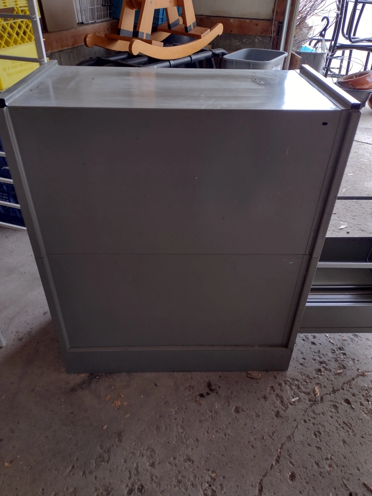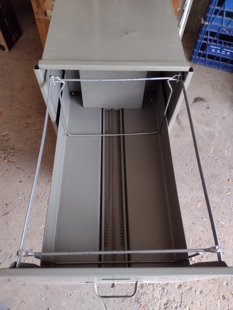 Metal file cabinet with two drawers. Each drawer comes with a hanging file rail. The cabinet is in good condition, and as some scratches.