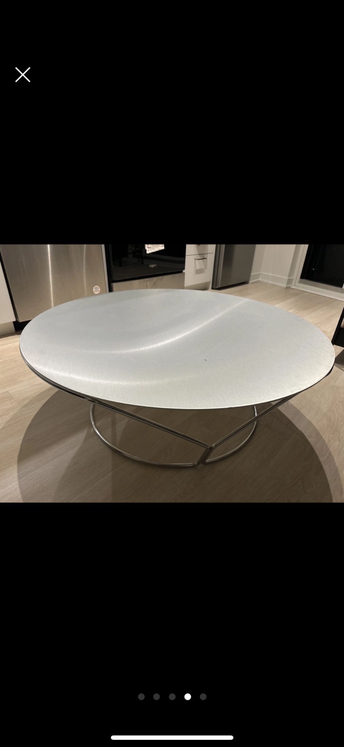 Lovely coffee table, suitable for living areas, office spaces, bedrooms and co-working areas. Round glass table on a chrome base. Made by Keilhauer. Original price was at $2,065. We love this table but having to sell it since we are moving.