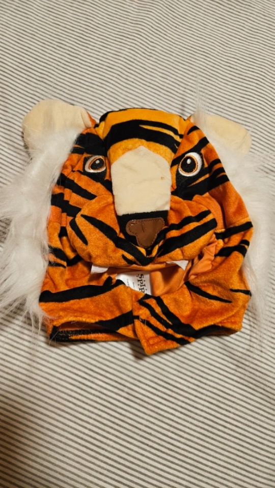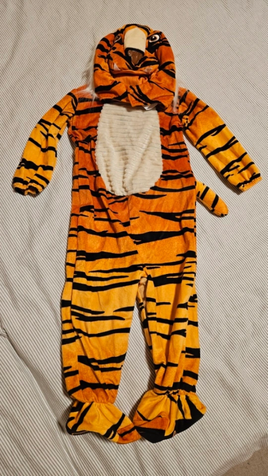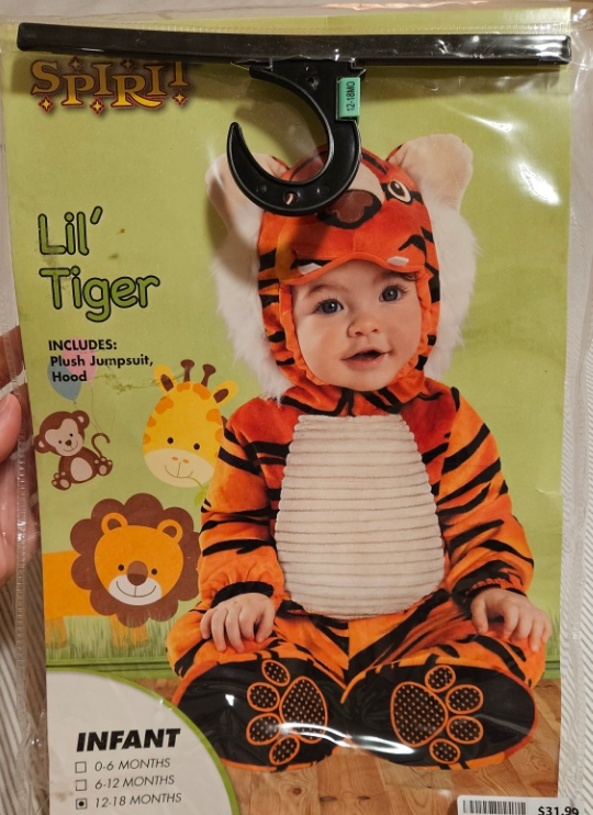 A Spirit Halloween Lil' Tiger costume. The costume is a tiger-striped jumpsuit with a hood. It features a plush fabric and an attached tail. The costume is in the size 12-18 months.