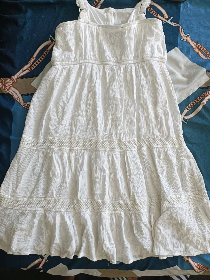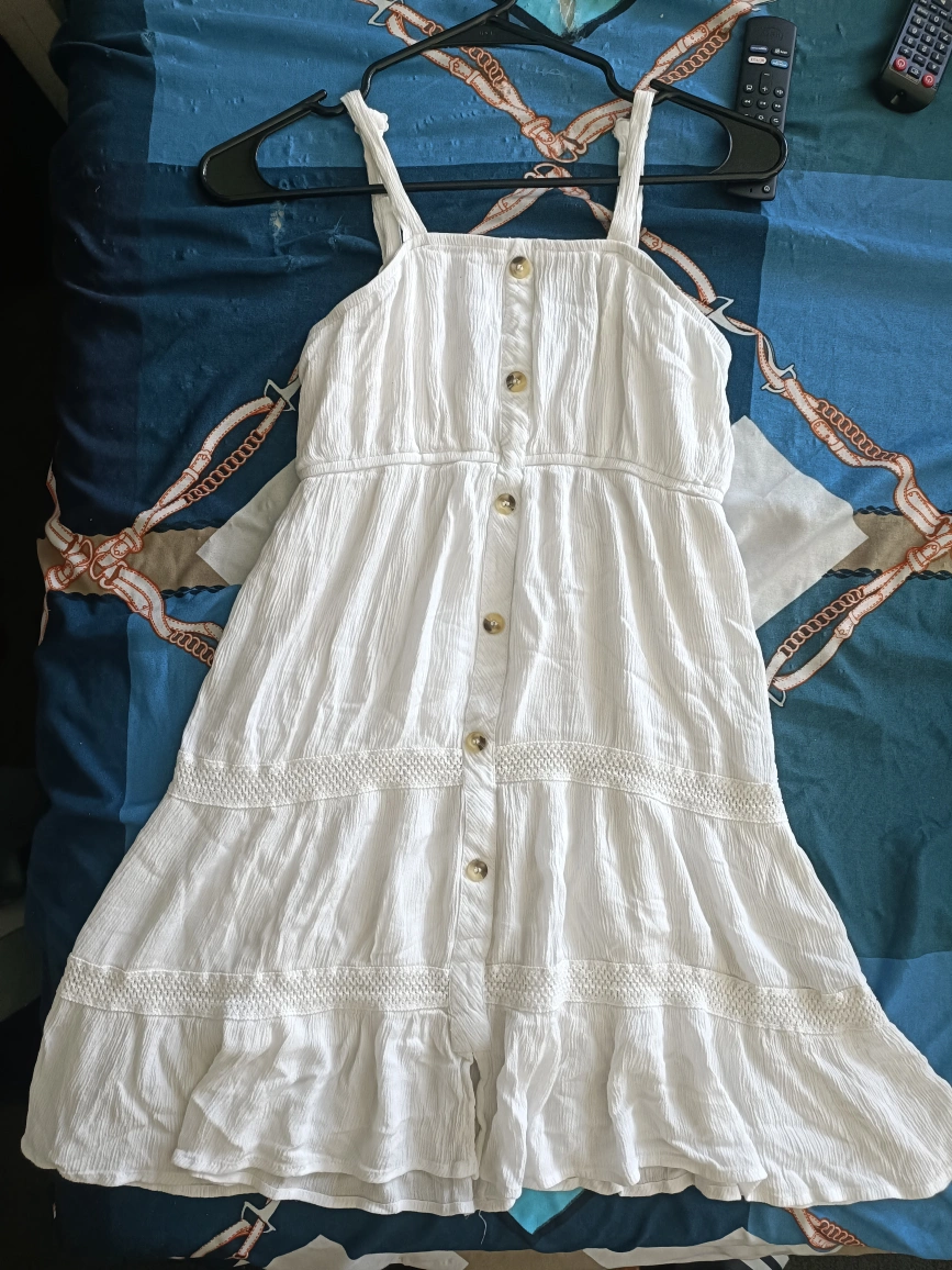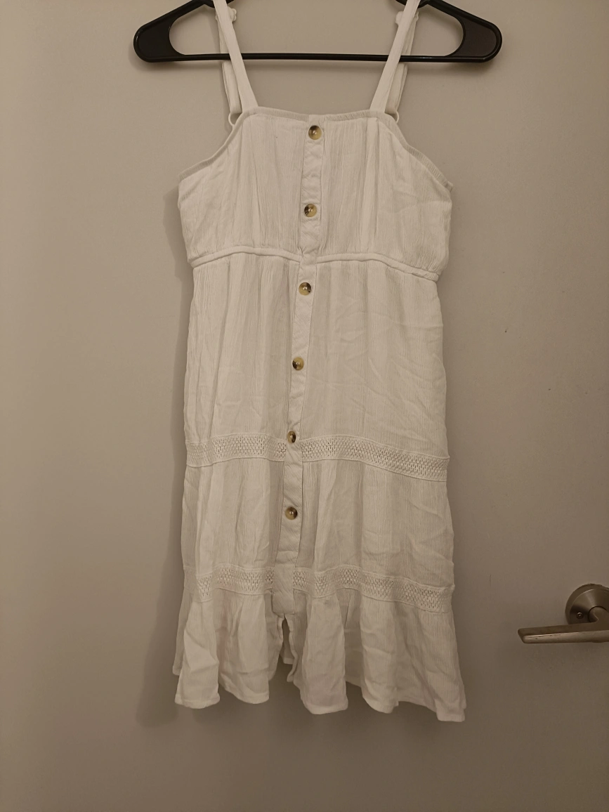 White button-down sundress with lace trim. Sleeveless with a fitted bodice and a flowy skirt. White/brown buttons down the front. No wear and tear. Selling because it doesn't fit anymore. Size-small.