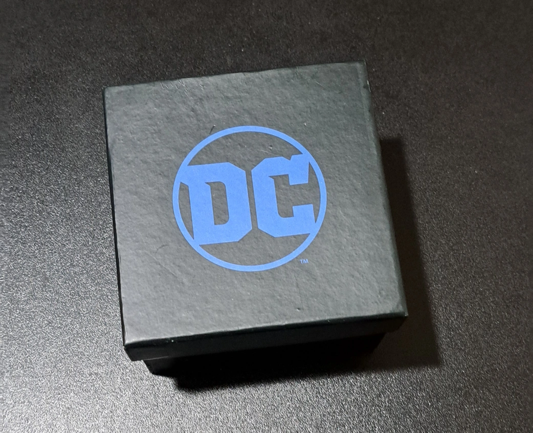 This set includes a tie and a pocket square with a grey background and various DC Comics logos in black. The set comes in a black box with the DC logo.