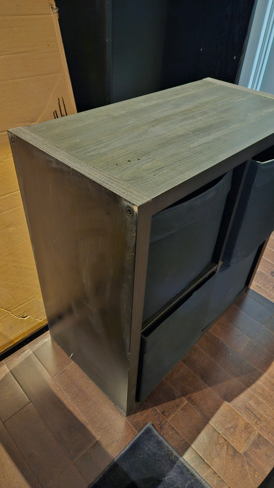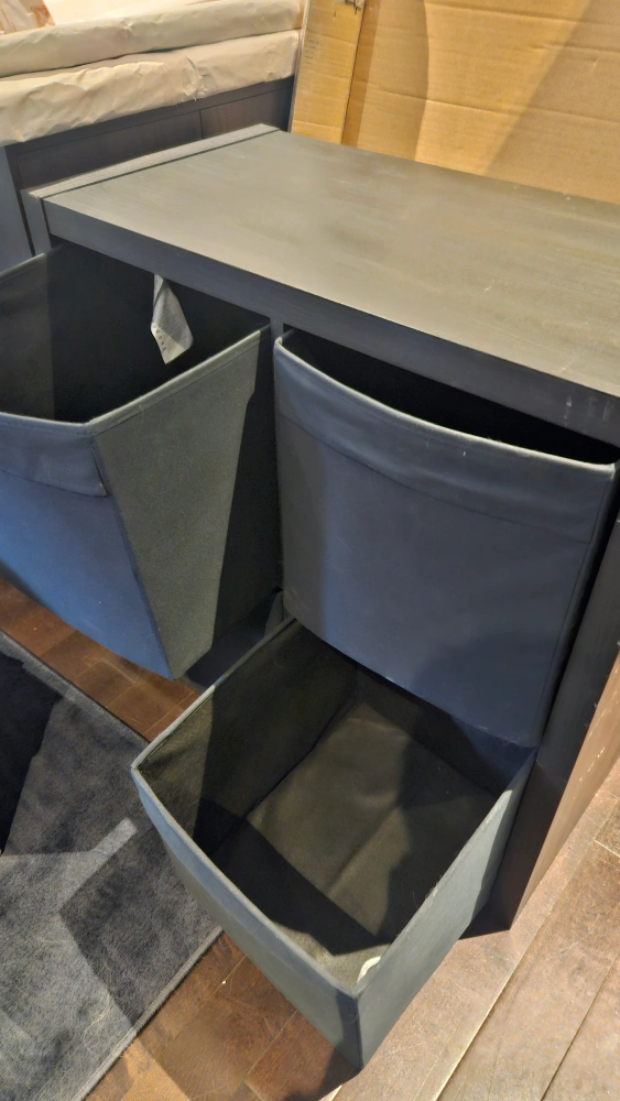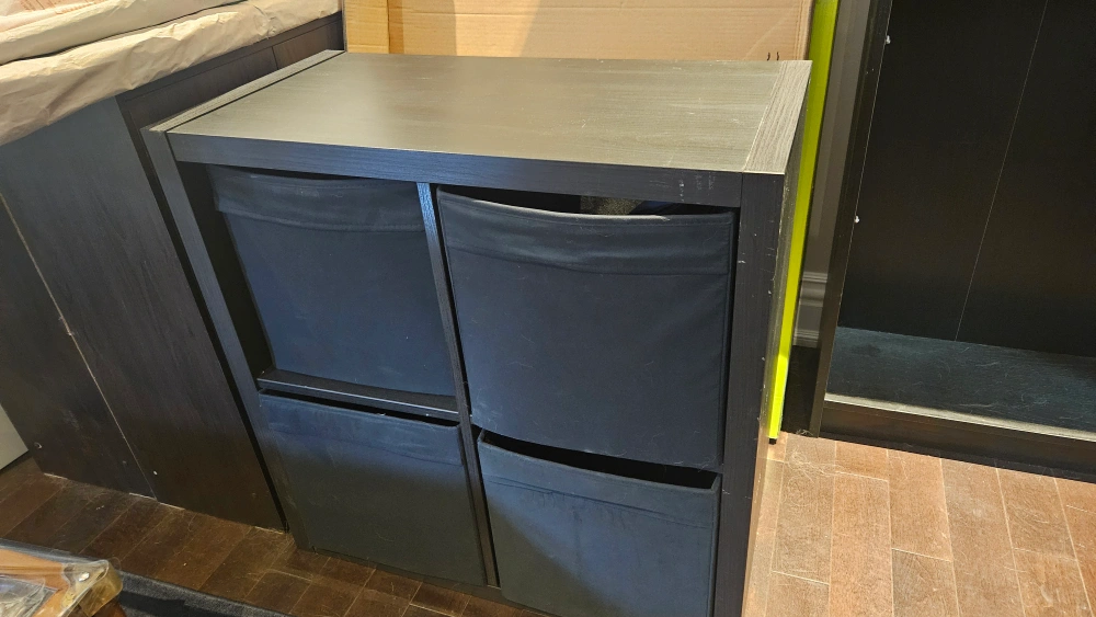 Black wooden shelf unit with four fabric drawers. Great for storage and organization. A few scuffs, but in good condition.