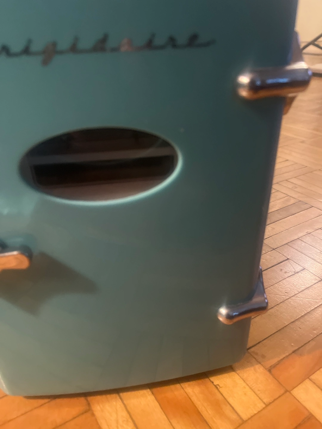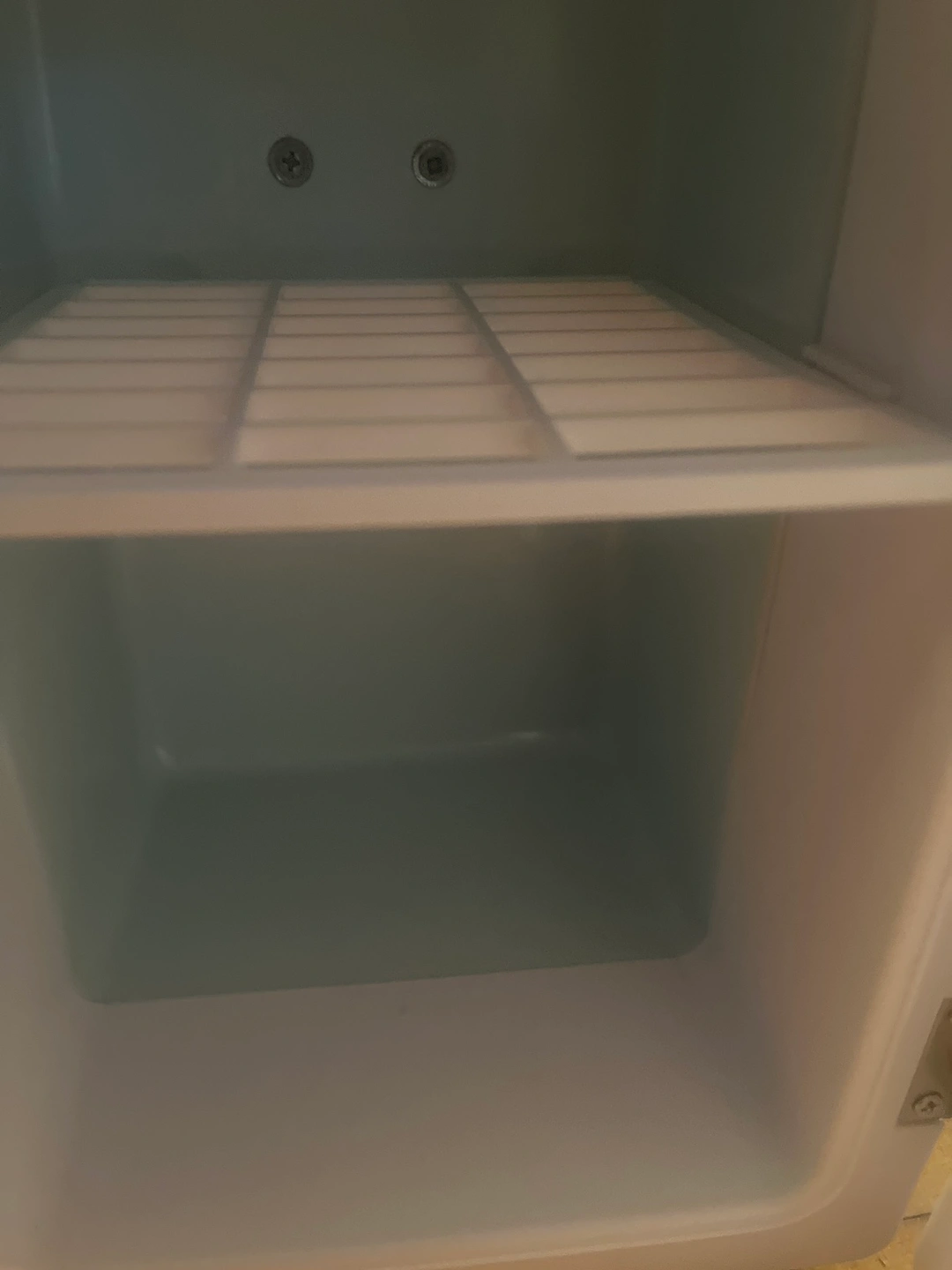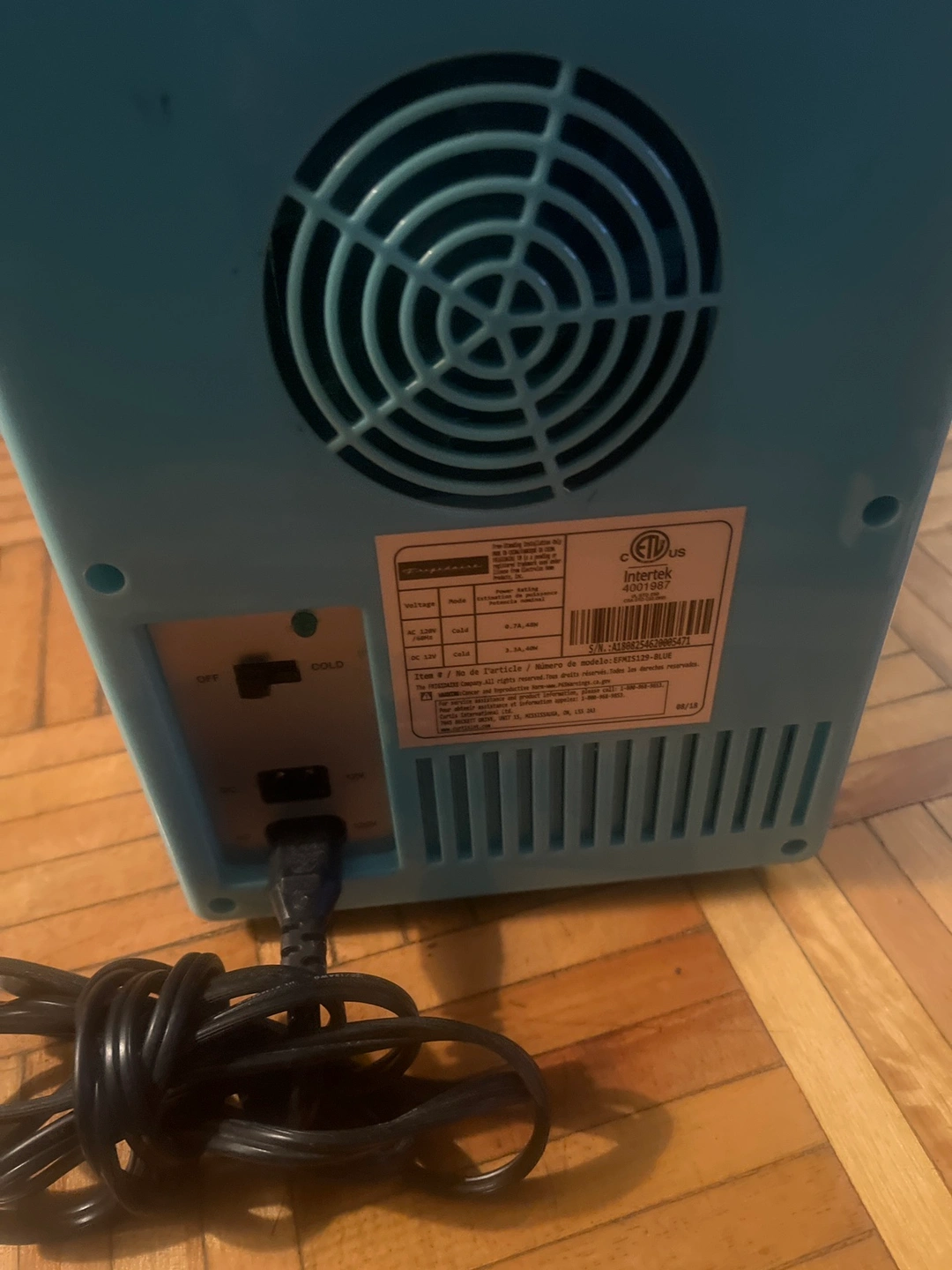 Small, portable fridge with a wire shelf. It has a removable door that opens to the right. Includes a power cord. The fridge is approximately 12 inches tall, 10 inches wide, and 10 inches deep.