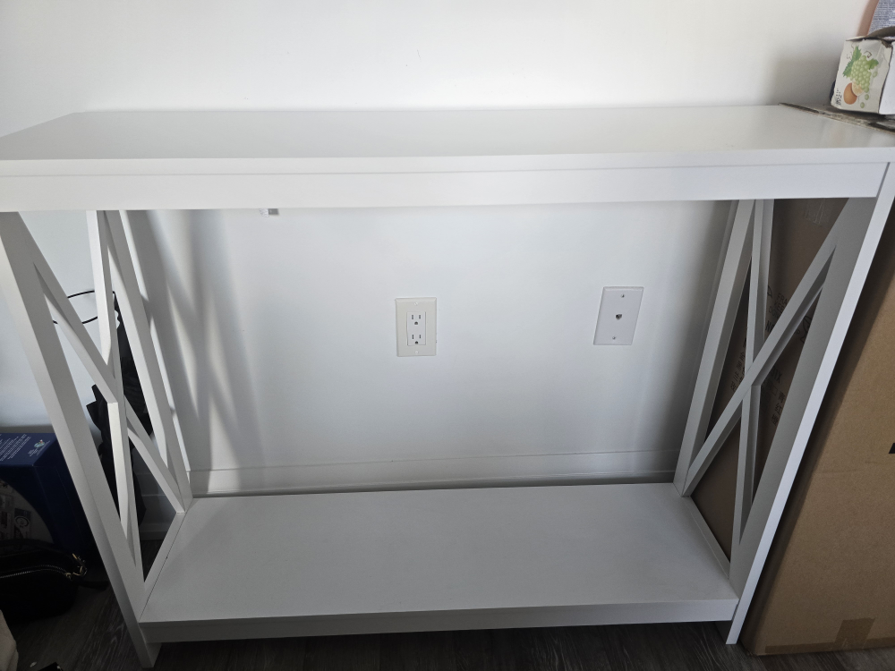 A white console table with a single shelf. It is made of wood and features a simple, modern design. Some small scratches on top as shown in picture.