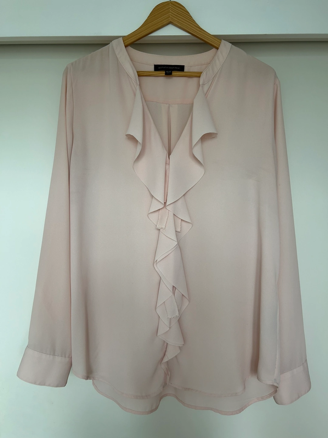 A light pink, long-sleeved blouse with a ruffle detail. It has a mandarin collar and button closure.