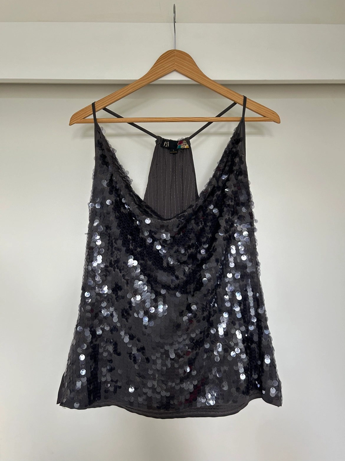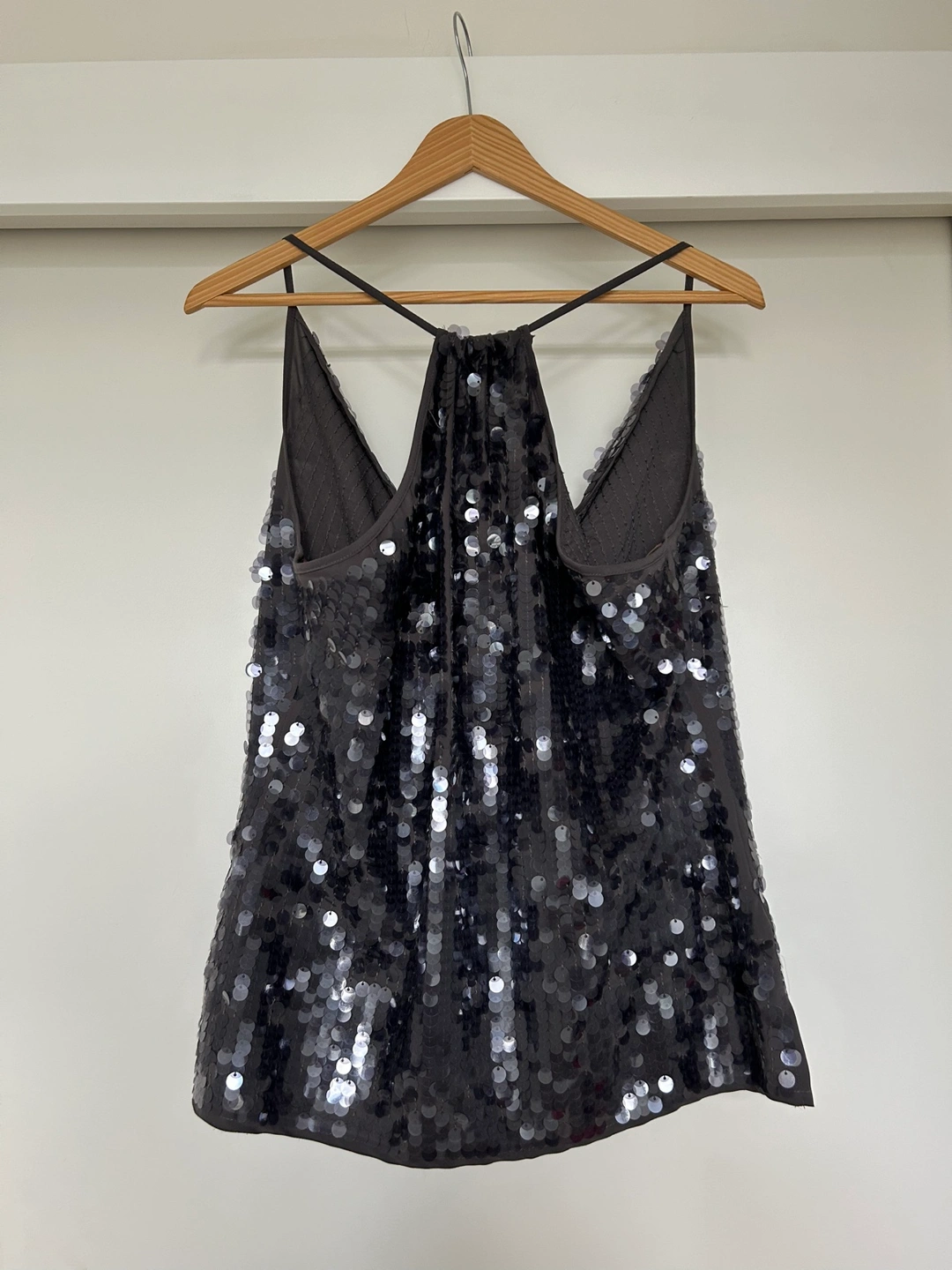 Size L, grey, sleeveless, with sequined detailing. This is a great piece for a night out or a special occasion. It’s so cute on and perfect for dancing!