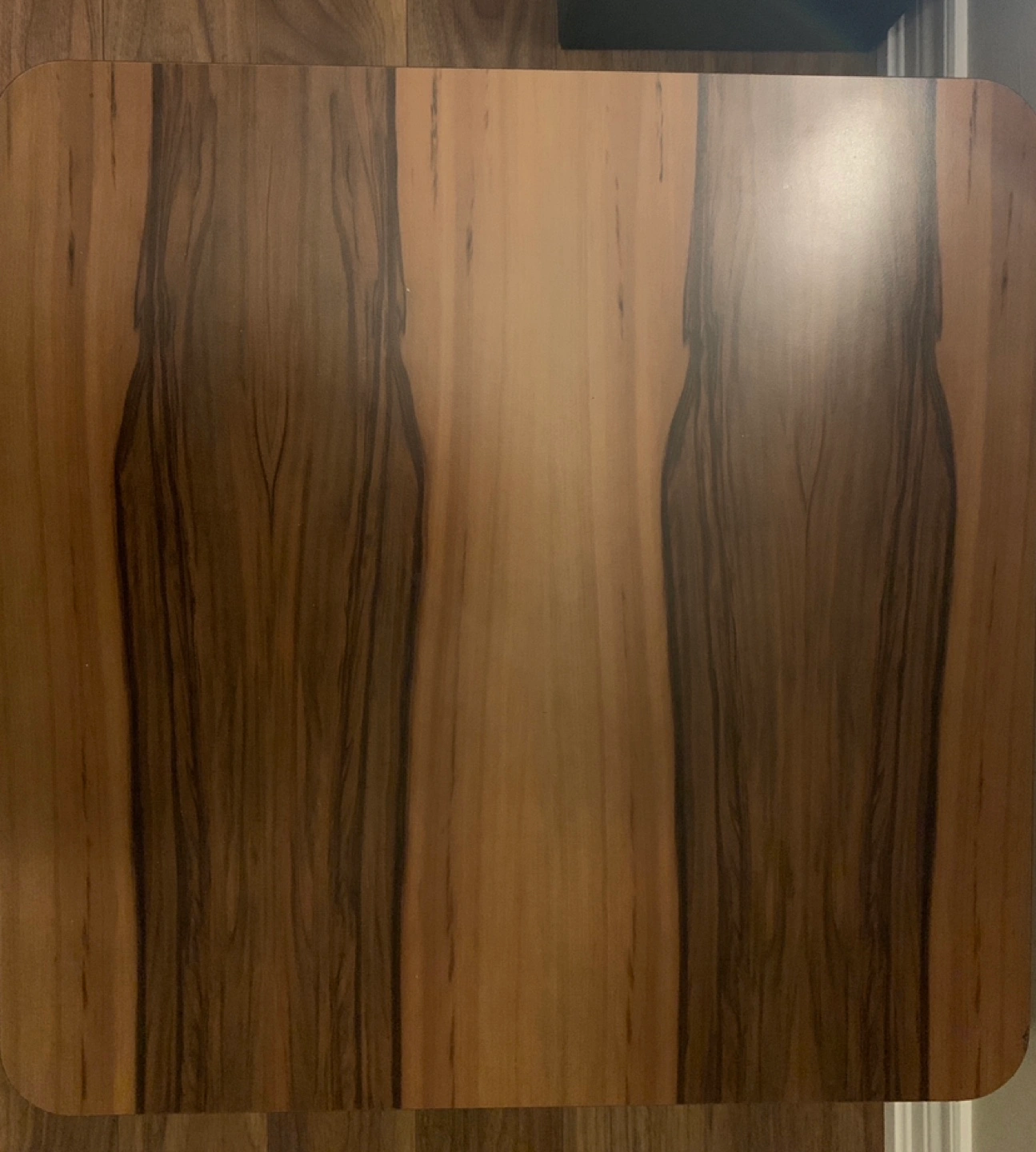 Korean small folding table with a wood grain top and metal legs. It is lightweight and easy to store. Perfect for small spaces. There is a small chipped part but not outstanding.