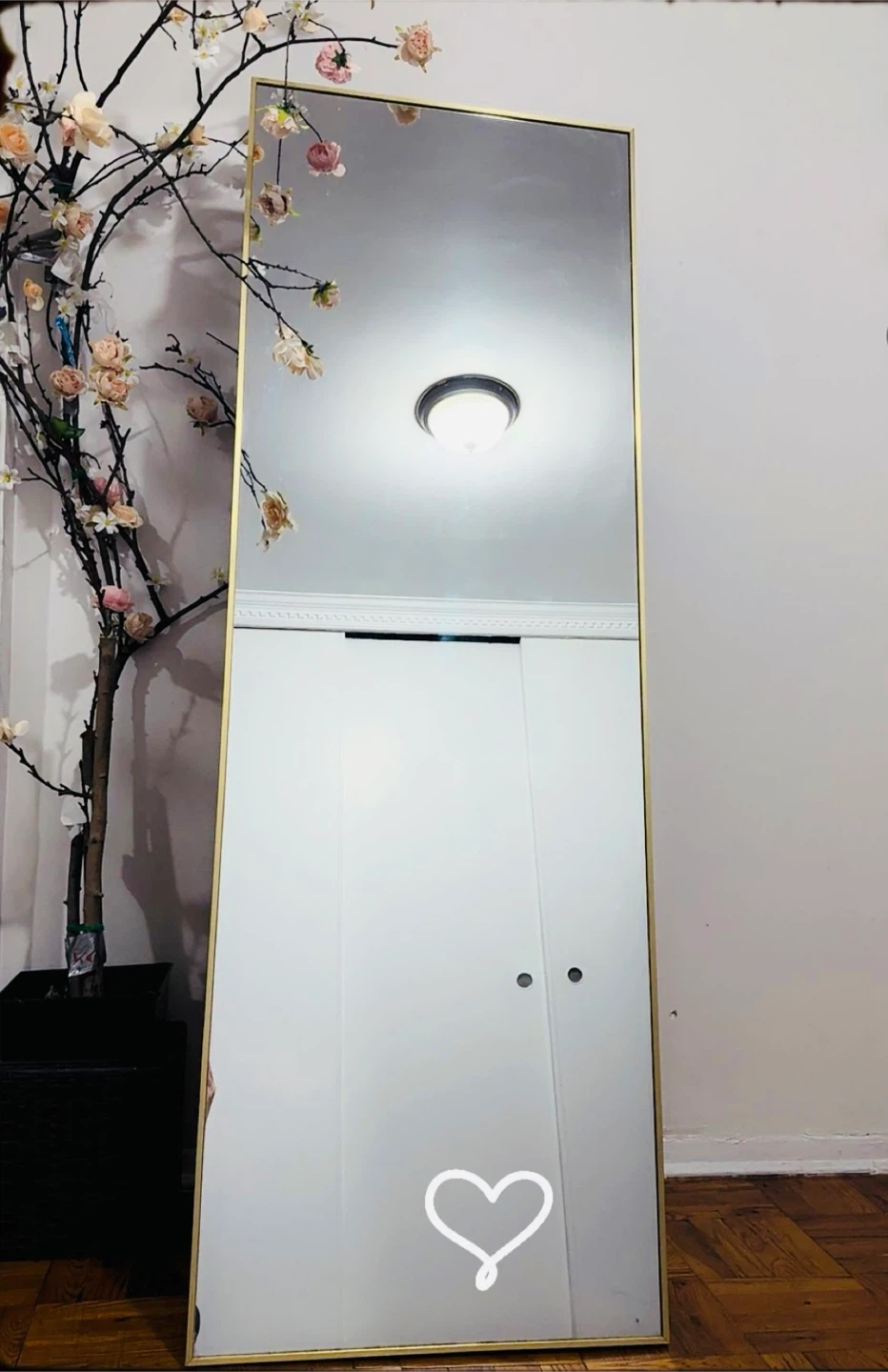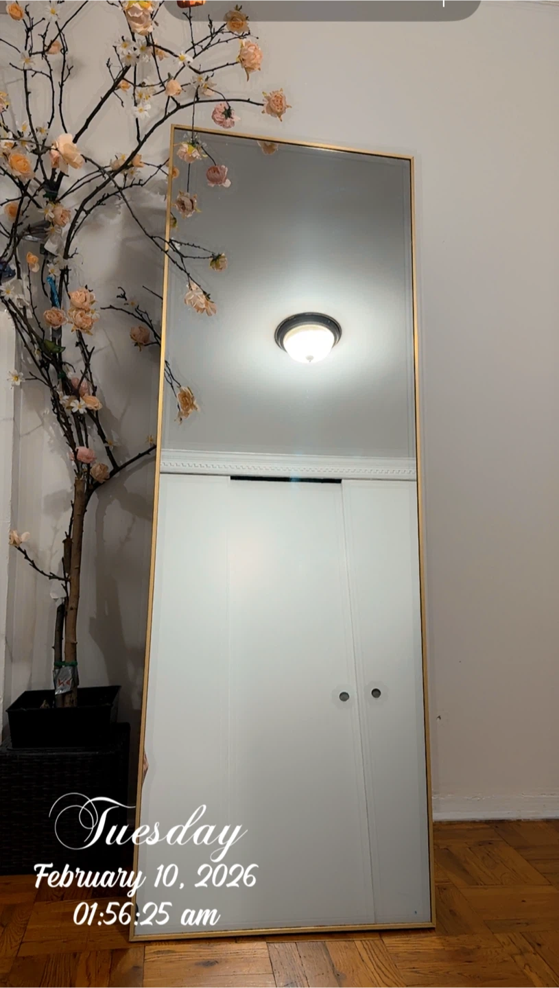 This is a tall, full-length mirror with a gold frame. It's perfect for checking your outfit before heading out. The frame is sleek and modern.