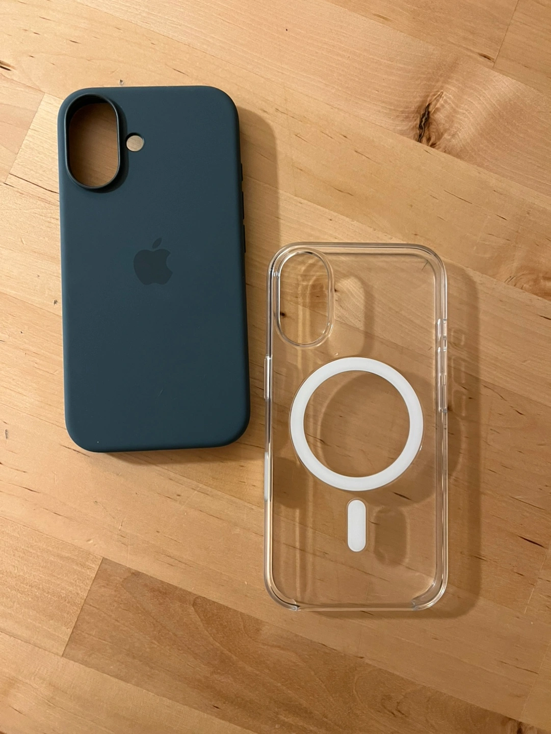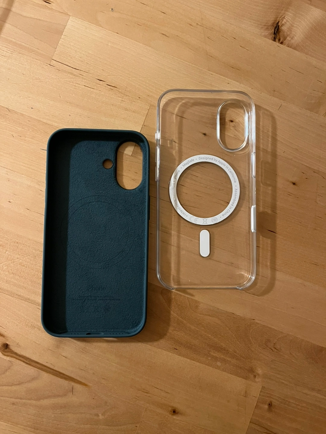 One is a dark teal silicone case and the other is a clear case with a ring on the back. They are both Apple MagSafe.