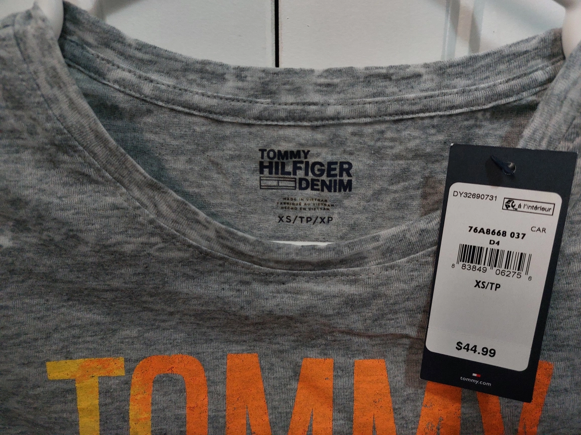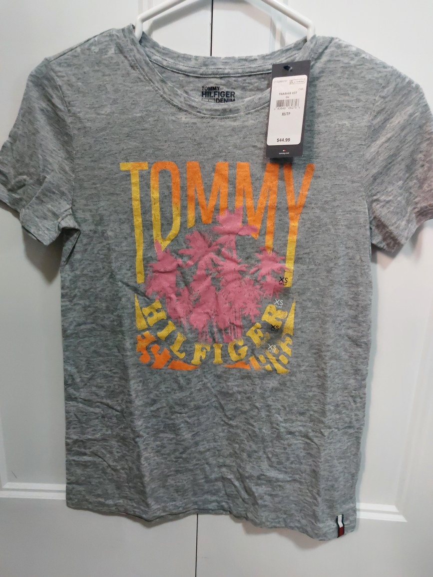 New Grey t-shirt with Tommy Hilfiger logo on the front. The t-shirt has a palm tree design. The t-shirt is size XS/TP/XP.