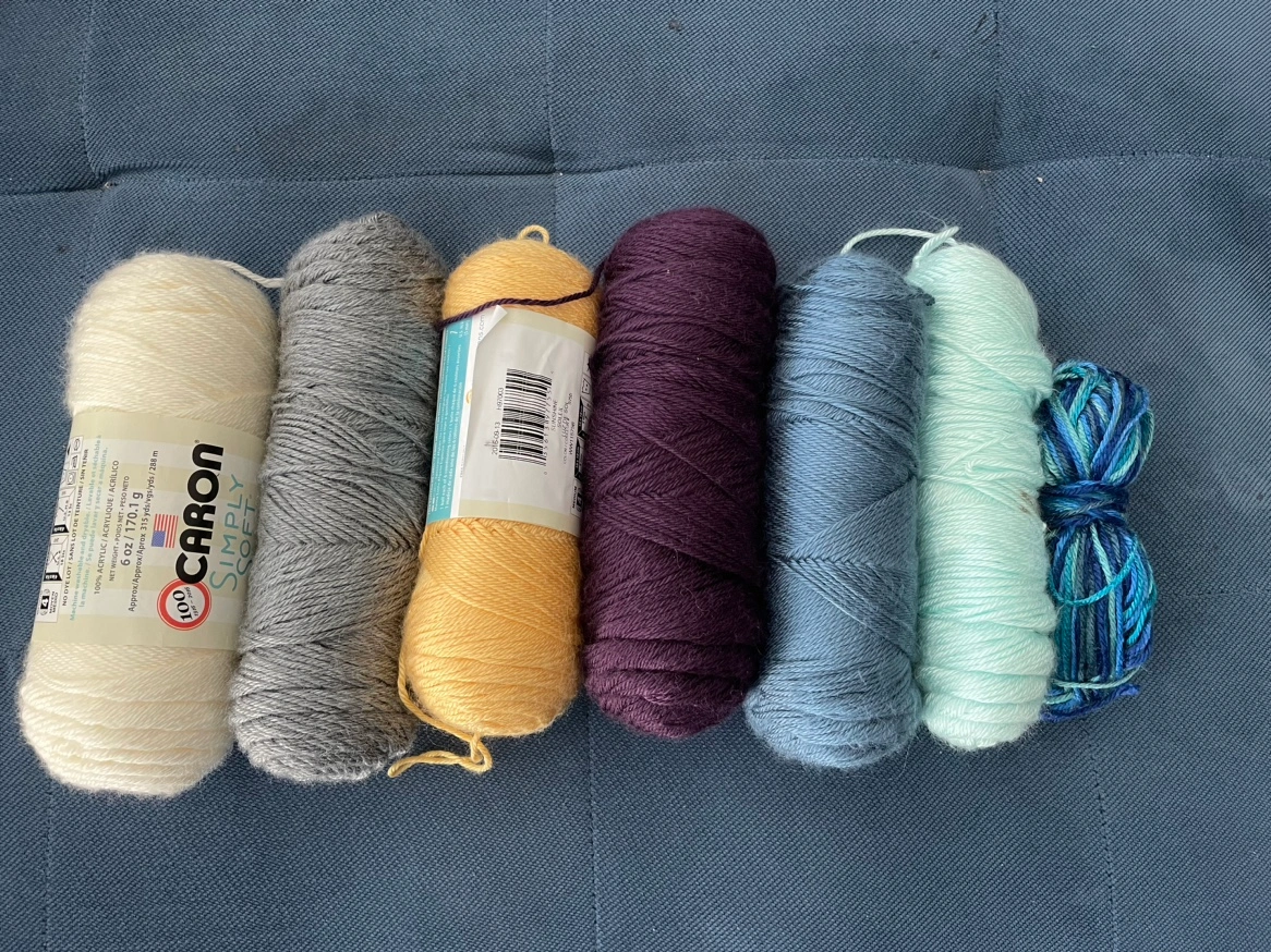 Mostly full Caron Simply Soft skeins (plus a bit of scrap blue). I likely have more in my stash somewhere so if you want more, please let me know (will change price). The mint colour has a small stain on it but is not too bad (can take a picture if requested).