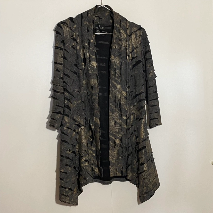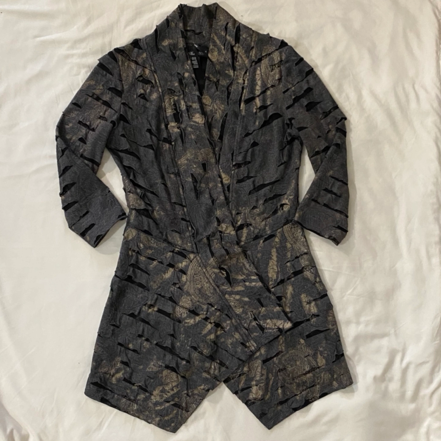 A long sleeved grey cardigan featuring gold accents and a draped design. The cardigan has a V-neck and is made of a soft, stretchy fabric. The cardigan is in great condition.
