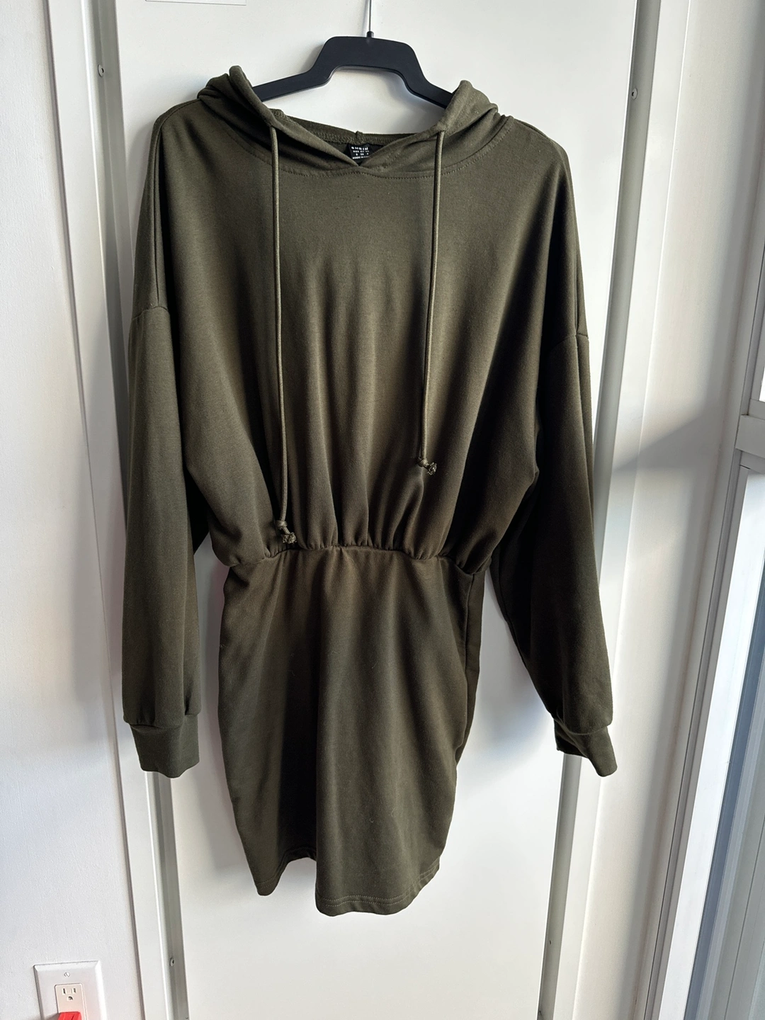 Green Shein hoodie dress, size Large/US size 4. It is a cinched waist dress, with a long sleeve and hoodie. It has a relaxed fit. It would be cute with tights or leggings. Good for fall or spring!