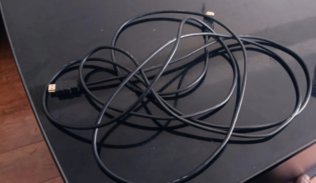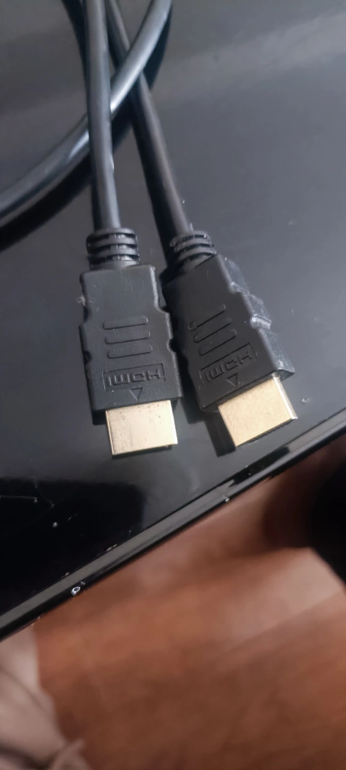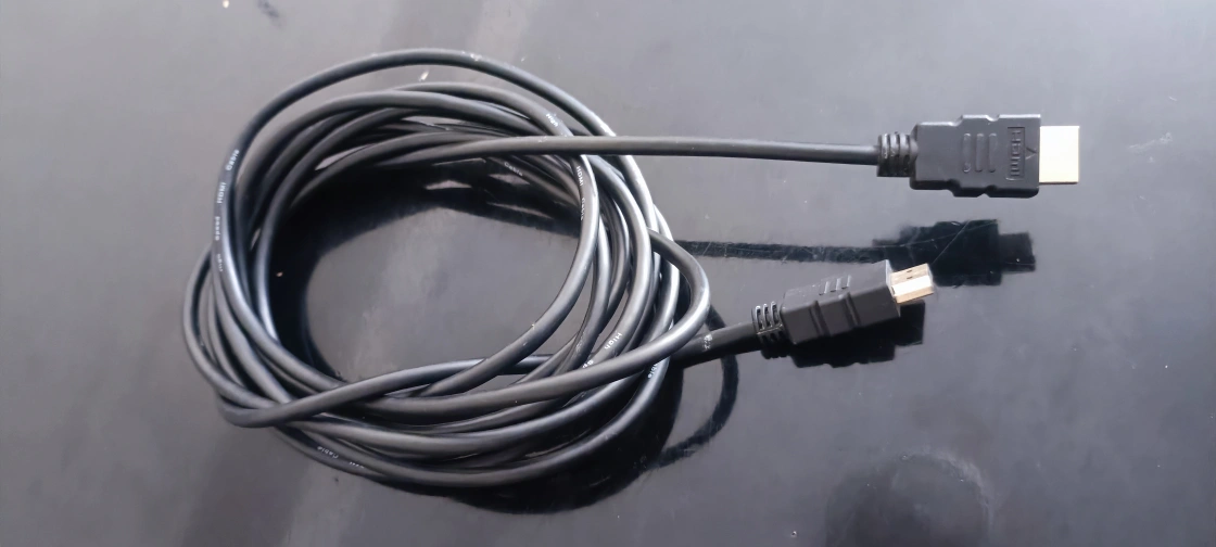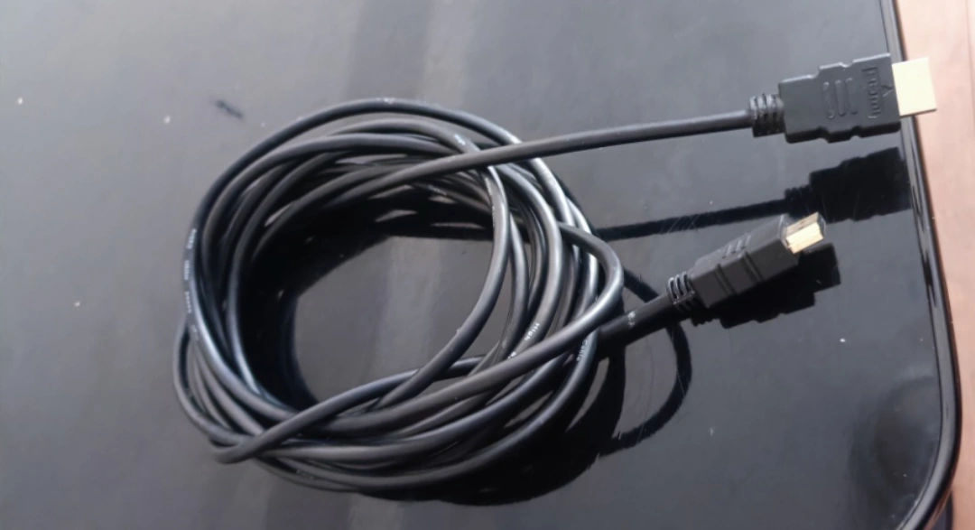 HDMI cable with male connectors on both ends. It is black and about 5 meters long.