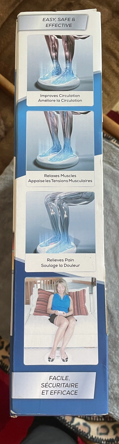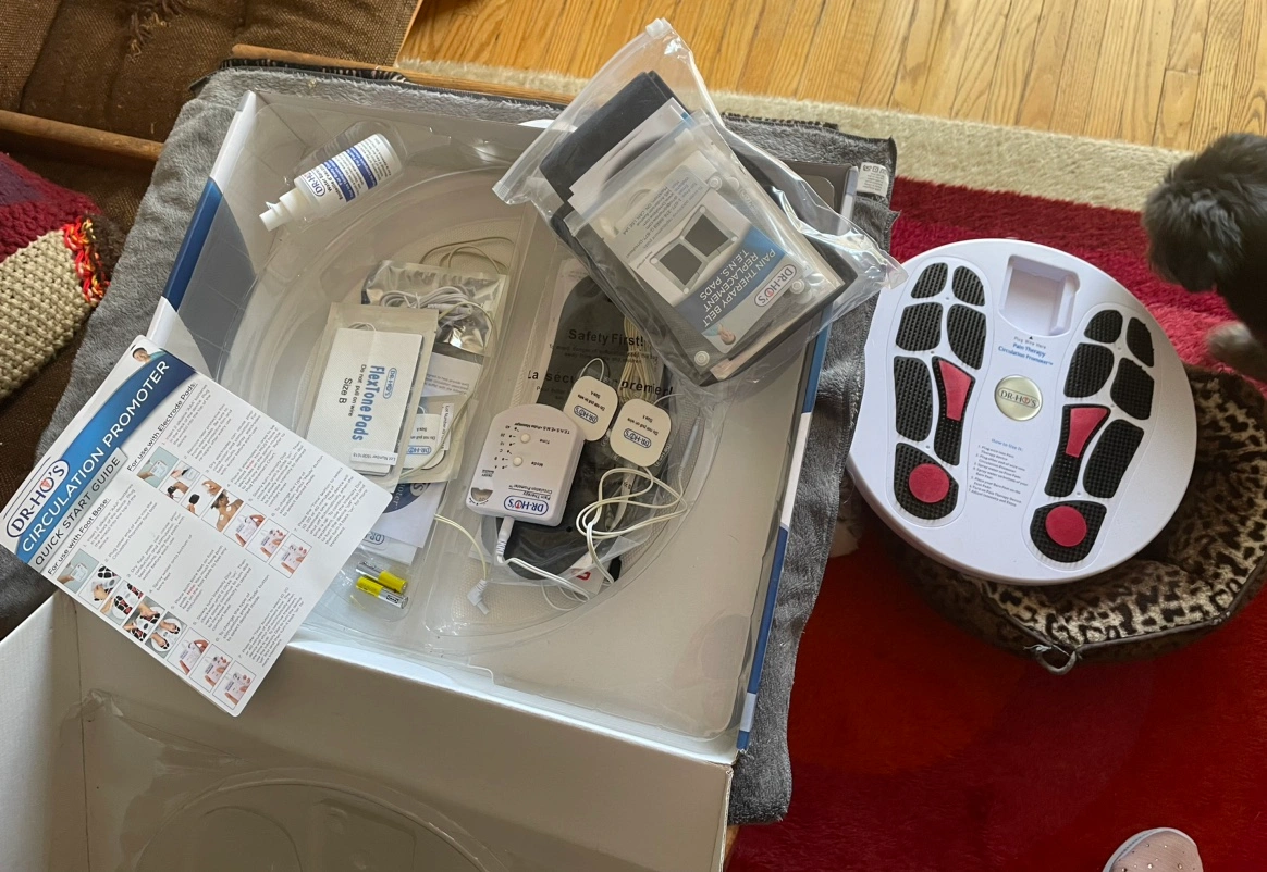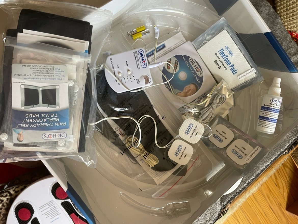 Circulation Promoter for foot and leg pain. Includes: foot pads, travel foot pads, pain therapy belt, pain therapy belt pads, and additional pads.