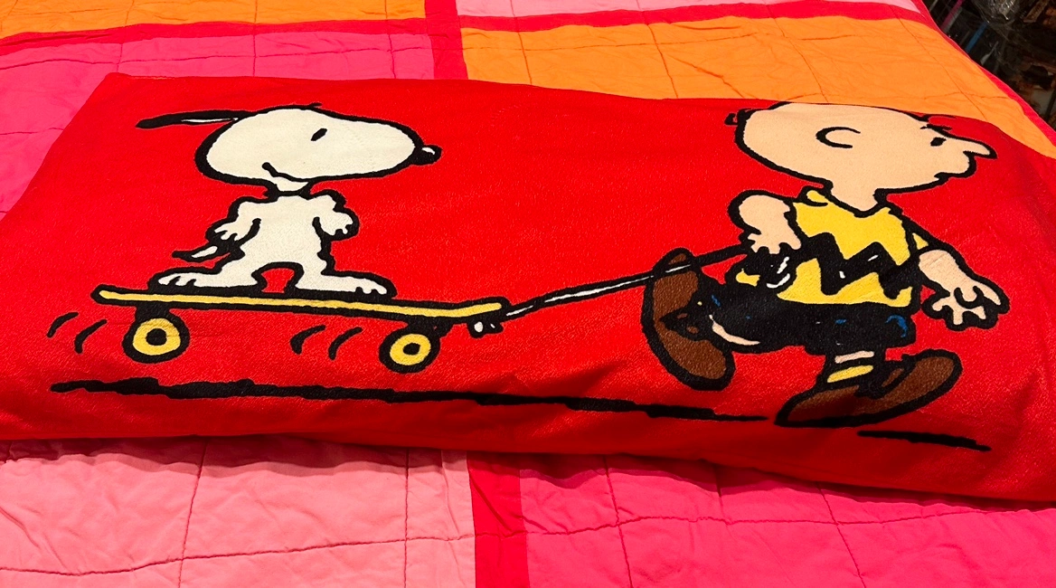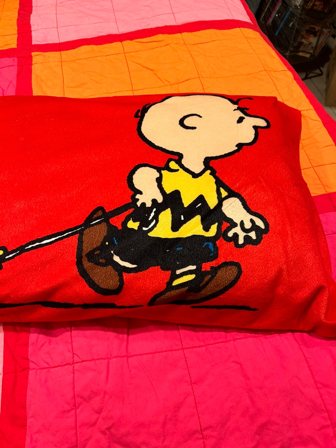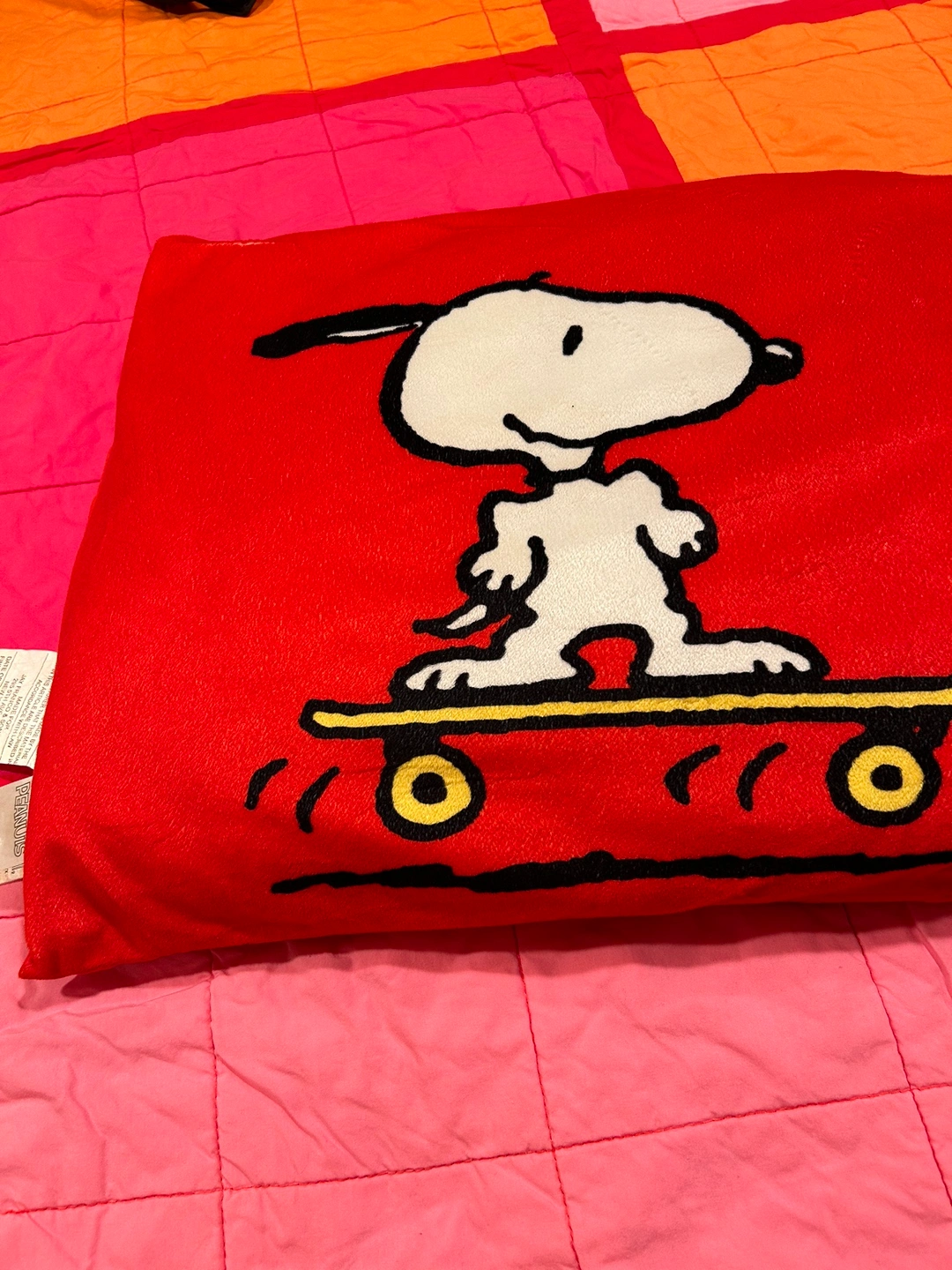 Decorative pillow with Snoopy on a skateboard and Charlie Brown walking behind him. The background is red. The pillow is approximately 24 x 16 inches.