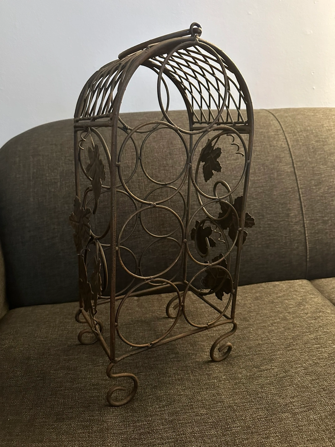 This is a metal wine rack with decorative grape leaves and an arched top. The rack is meant to hold 6 bottles of wine. The rack has four decorative feet.