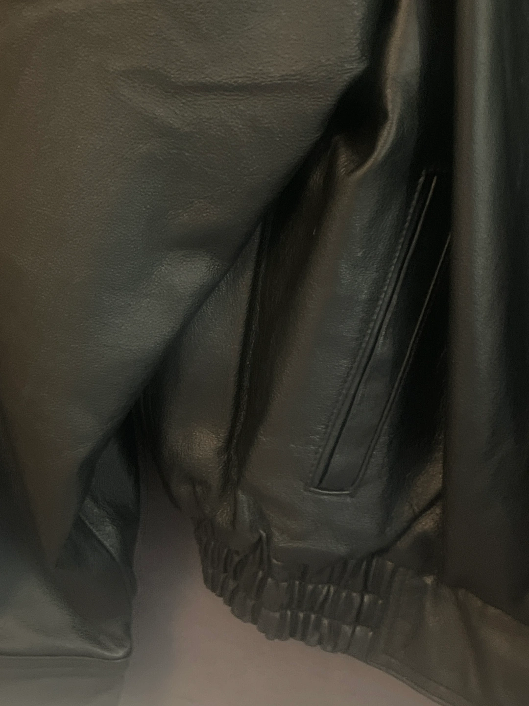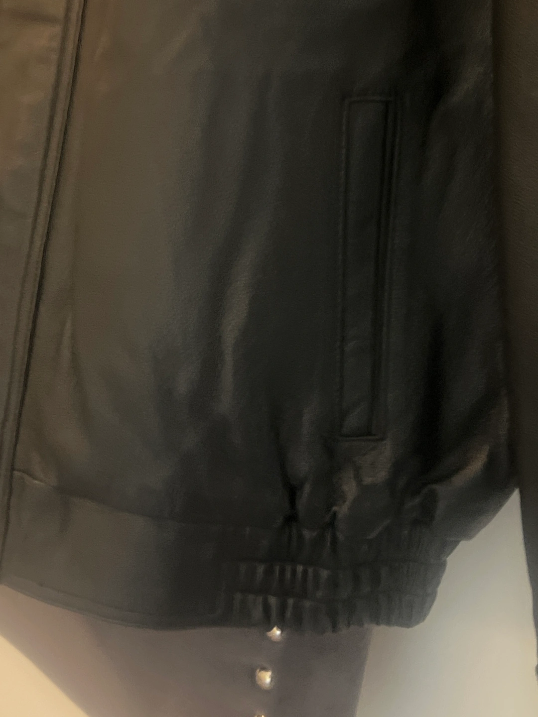 Black leather jacket with zipper closure, two front pockets, and elastic waistband.