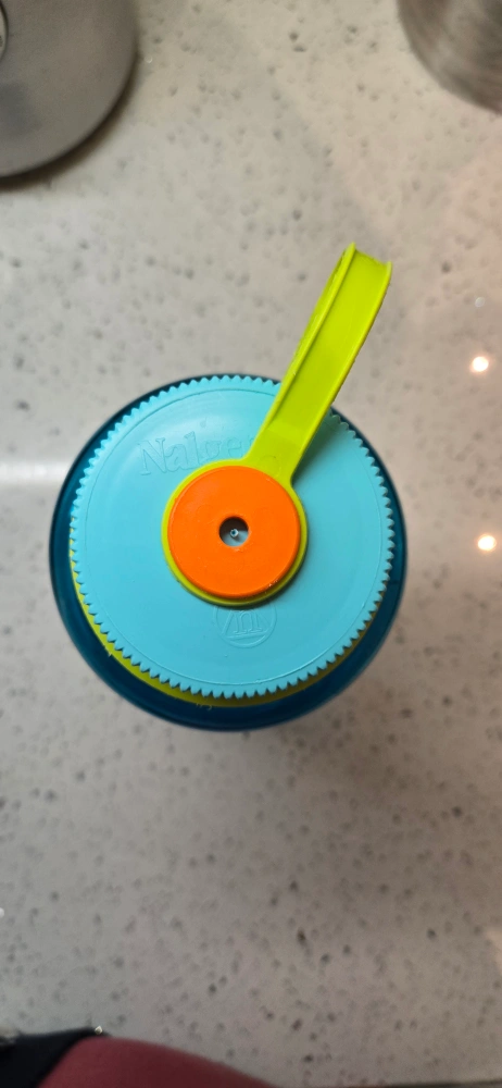 A blue Nalgene water bottle with a green handle and a blue lid. It has a wide mouth. The bottle is made from Tritan Renew.