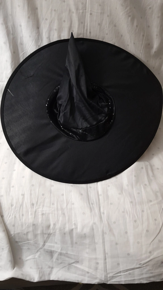 Black witchesπ§ββοΈhat with grey wig. The hat has a wide brim with ( fake )sequin detail. small snag on hat as seen in picture.