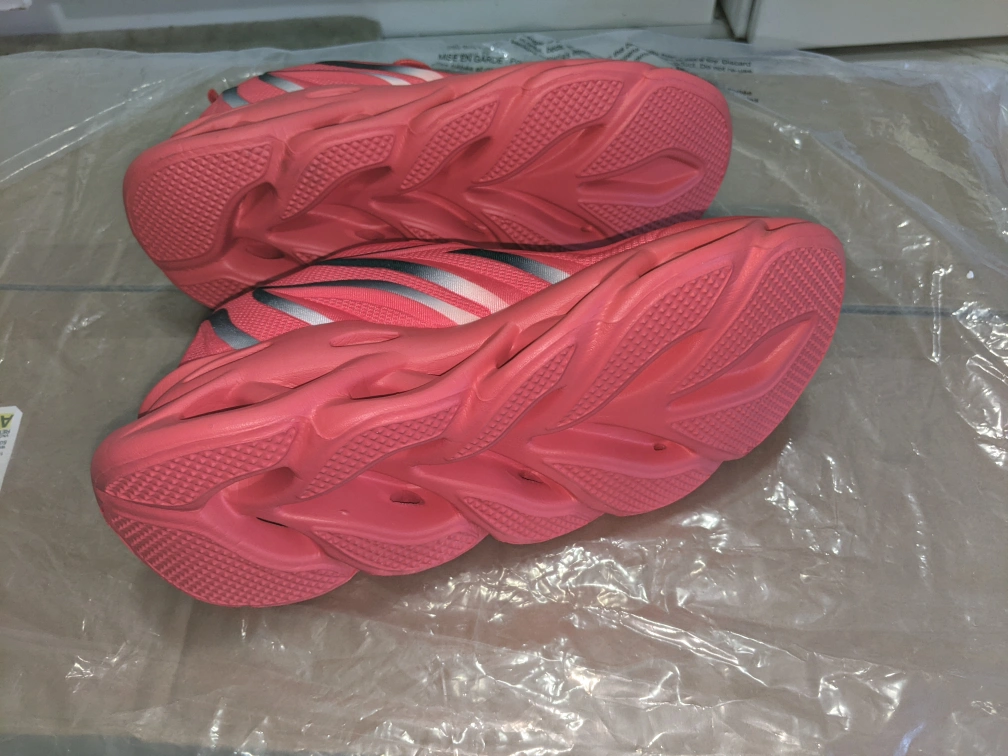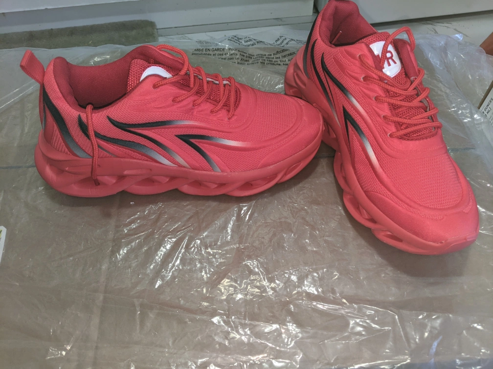 Brand New sneakers are red with black detailing. They have a unique and stylish design.