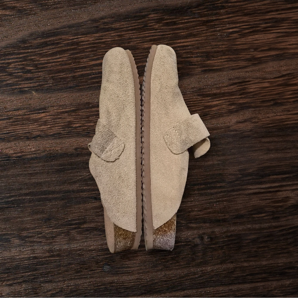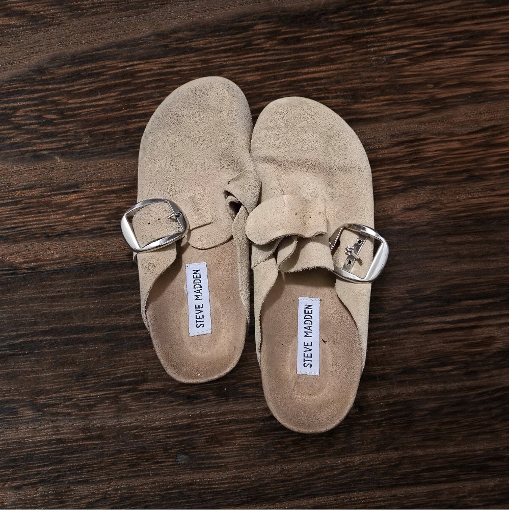 Beige suede clogs with silver buckle.