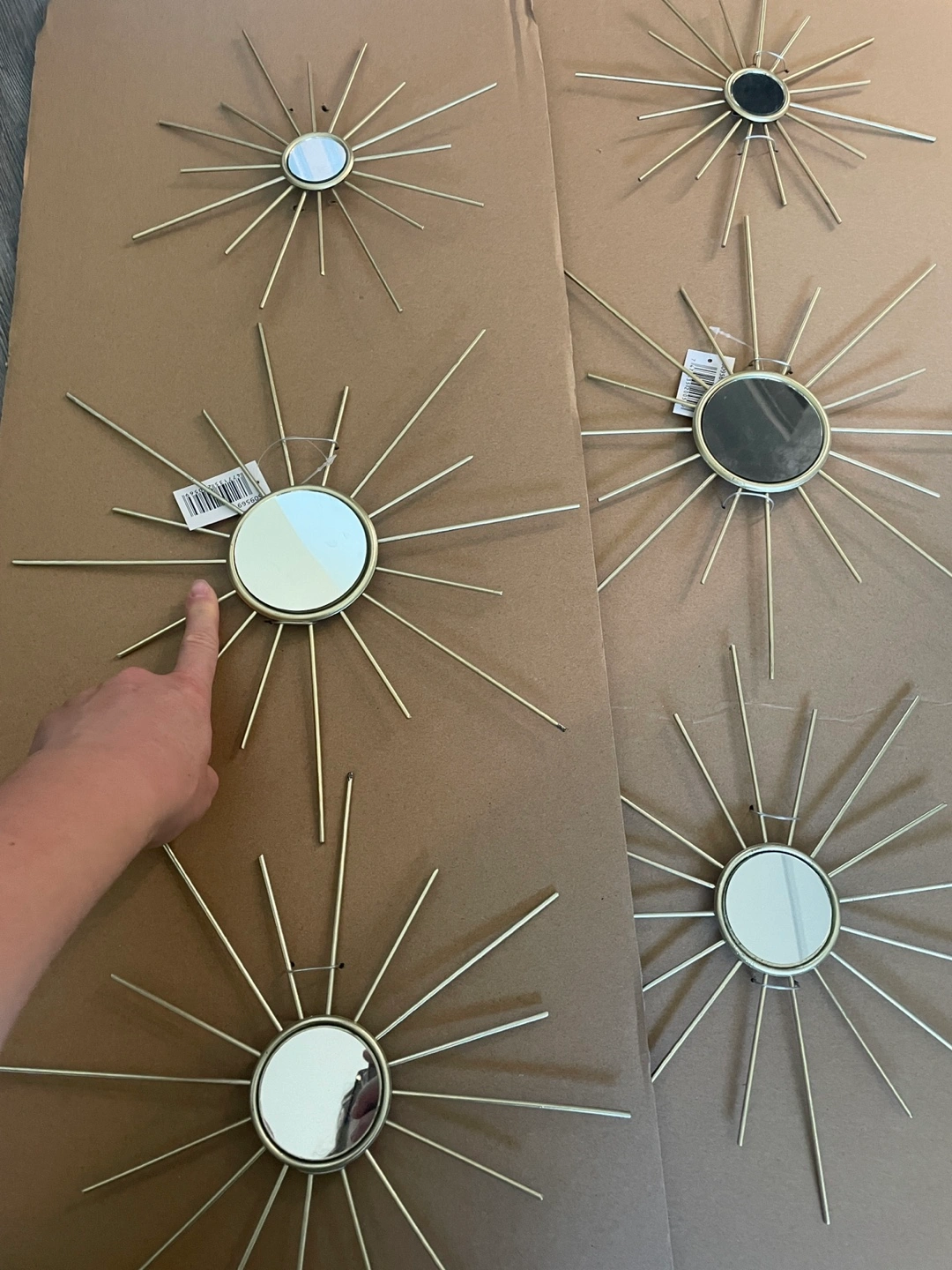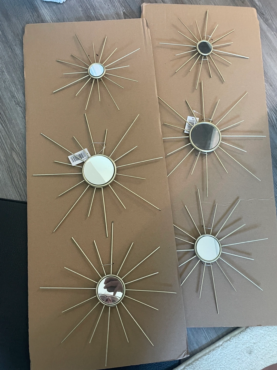 Set of 6 gold starburst mirrors. All mirrors have a round shape with the starburst design going out from the center. The size of the mirrors and starburst range from 6" to 8" in diameter. Price is for the pair.
