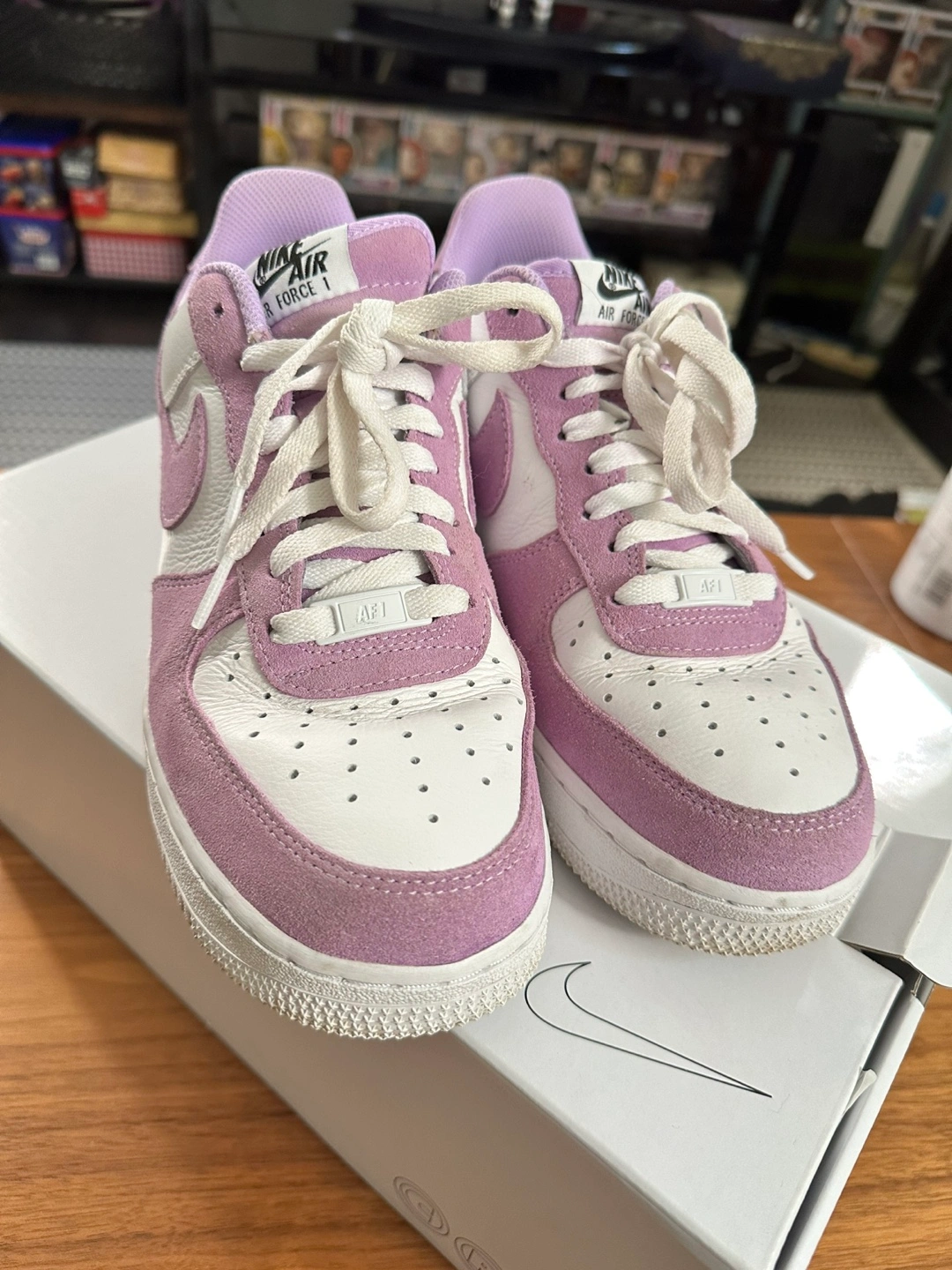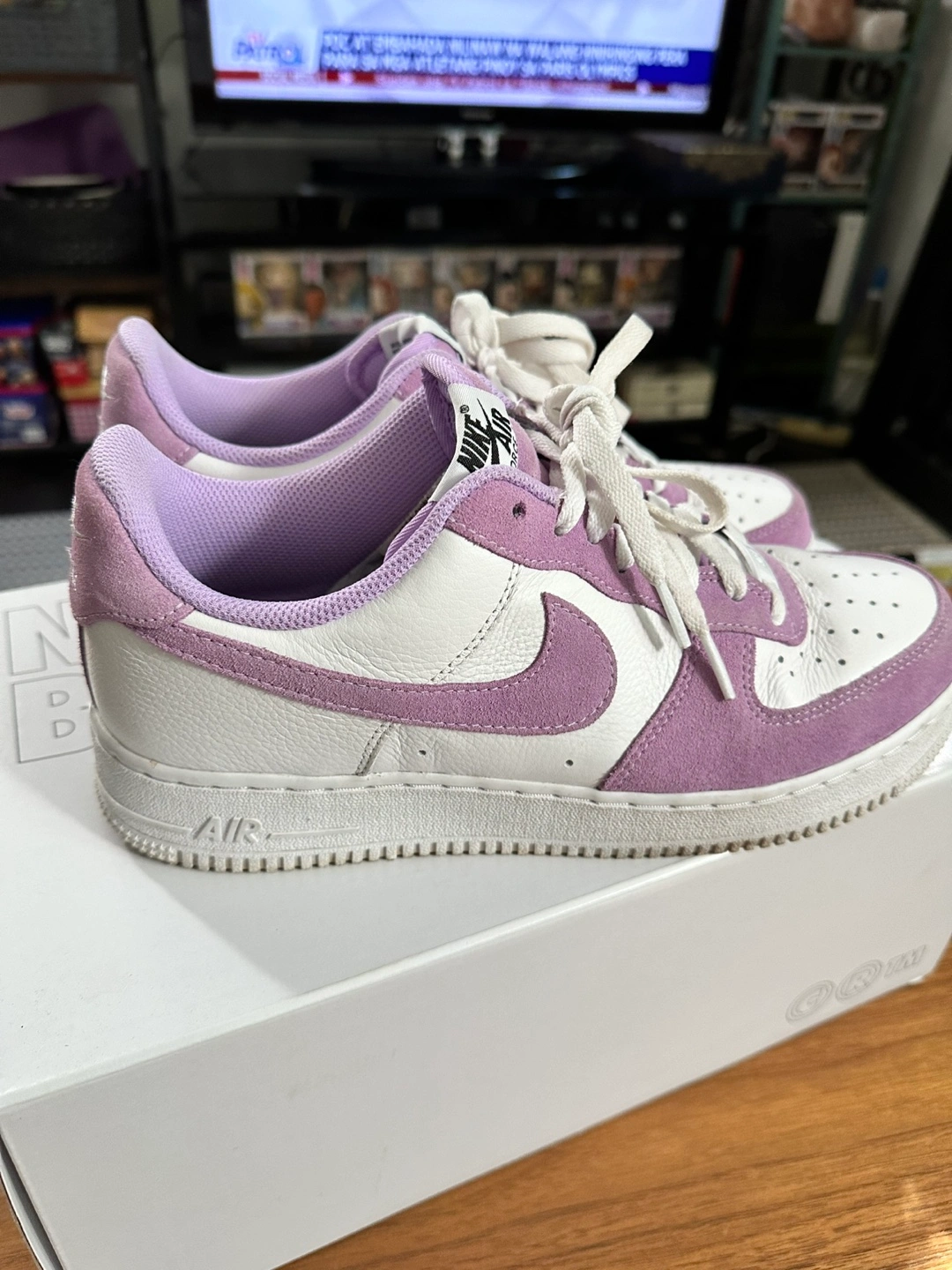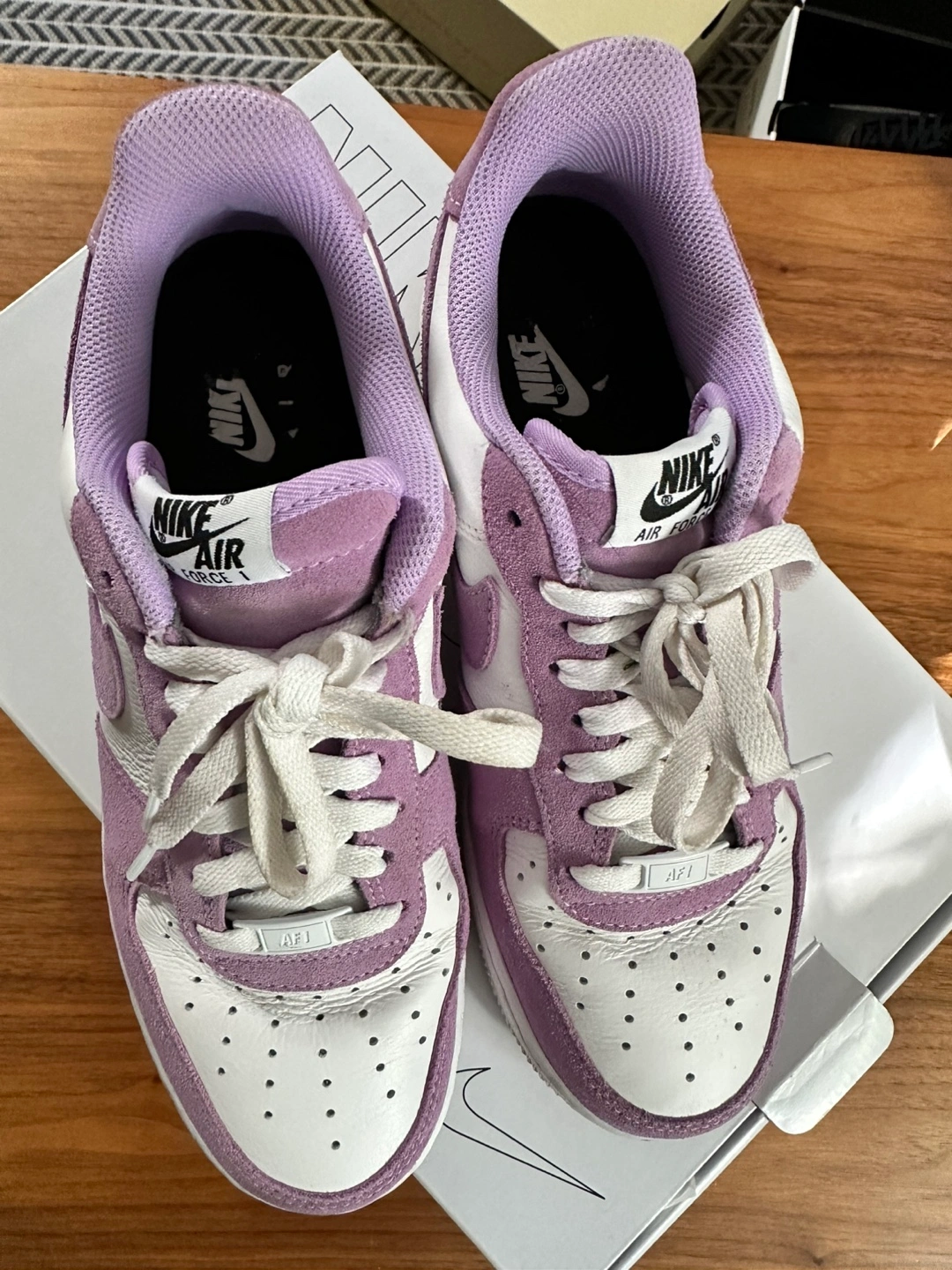 These are a pair of women's Air Force 1 Low sneakers. They are in a white and purple colour scheme. They feature a white leather upper, a purple suede overlay, a white midsole and a gum rubber outsole. They are a size 10