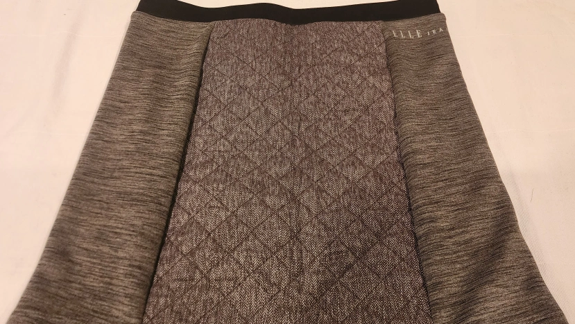 The skirt is made of textured material with a geometric pattern.