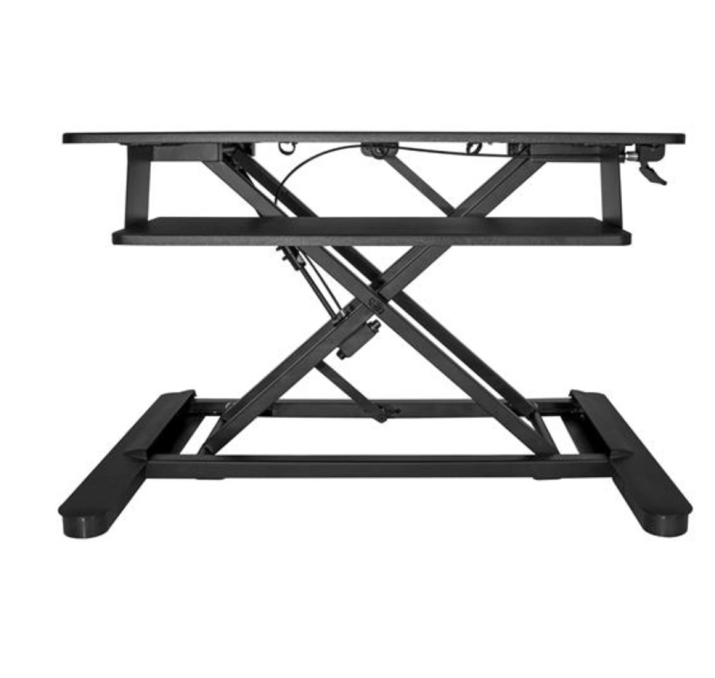 Black standing desk with manual height adjustment. Has a smaller shelf for a keyboard.