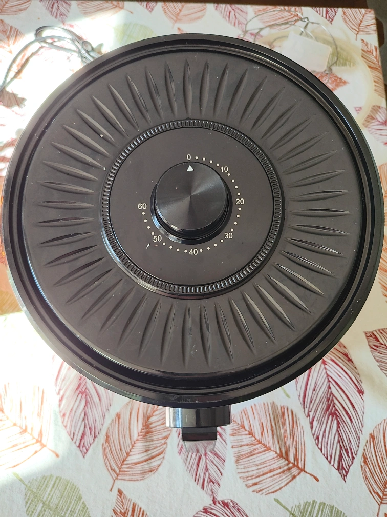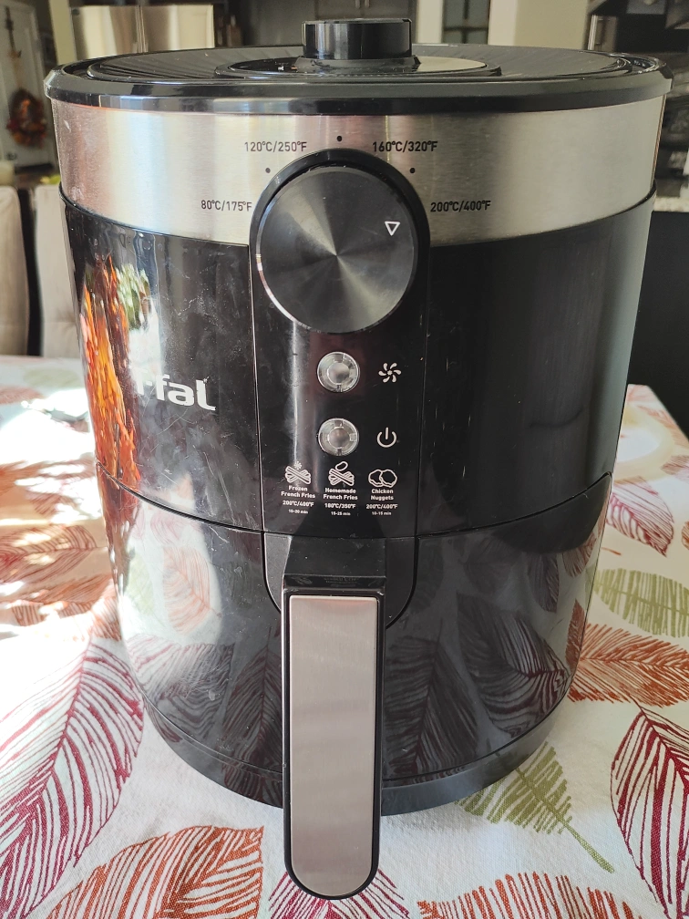 This is a black air fryer with a silver accent. It features a digital timer and temperature control with various settings.