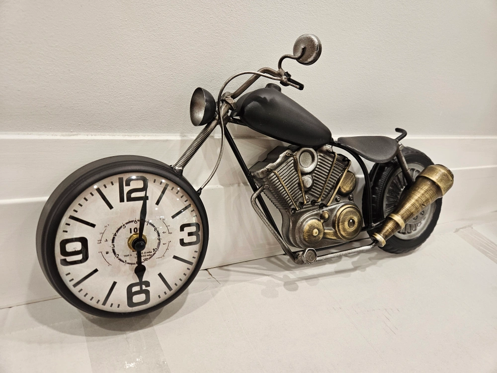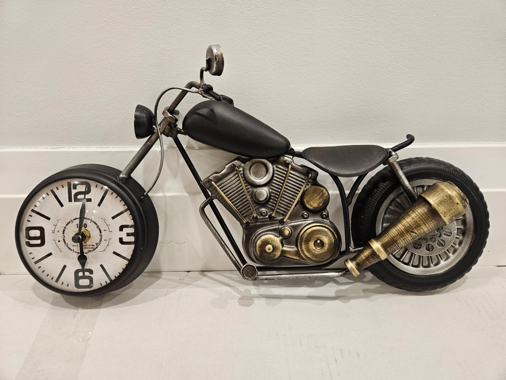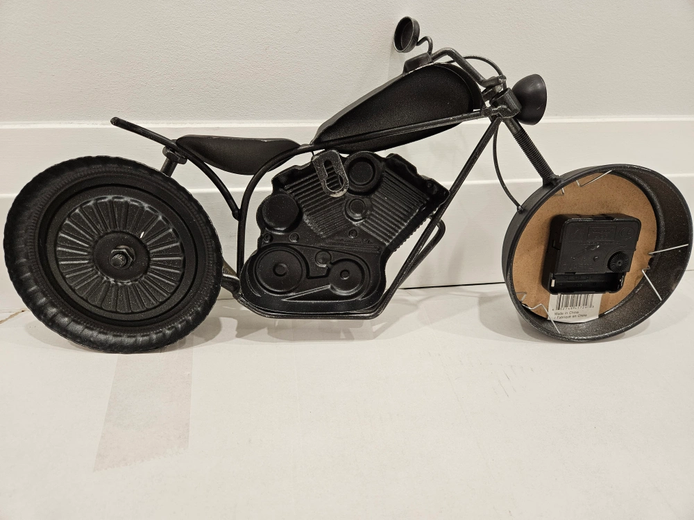 97A clock shaped like a motorcycle. The clock is black and silver. The clock is in working condition. It is battery operated. This is a great piece for any motorcycle enthusiast. Brand new in the box Metal but very light weight 18 x9 inch Wall clock Check my other ad more decor