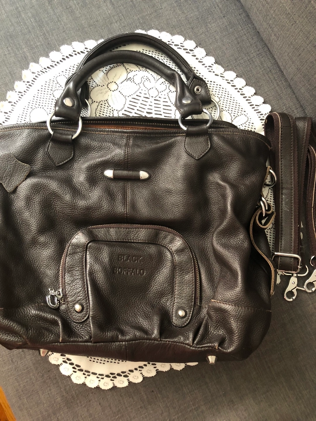This is a large Black Buffalo leather bag. It is brown in colour and features a top zipper closure, top handles, and a detachable adjustable shoulder strap. It also has a large zippered pocket on the front and a smaller zippered pocket on the back. The bag is lined in brown fabric and features an interior zippered pocket and two open pockets. It has very good quality leather and many pockets to keep your stuff organized.
