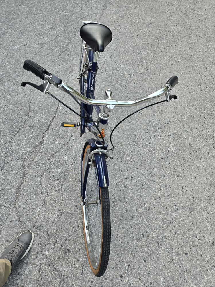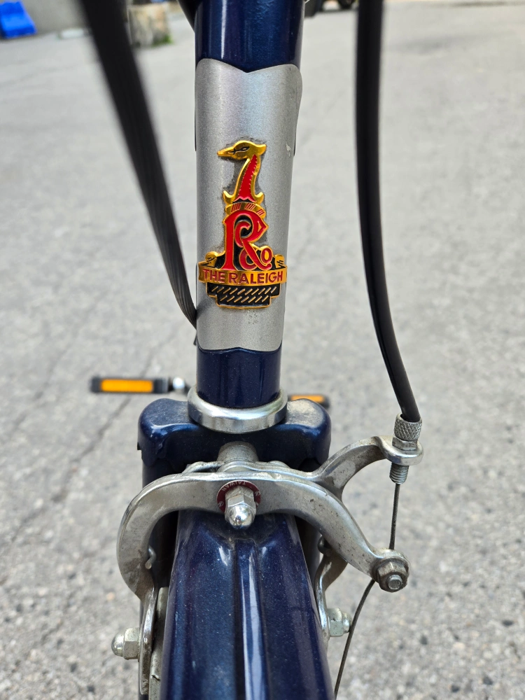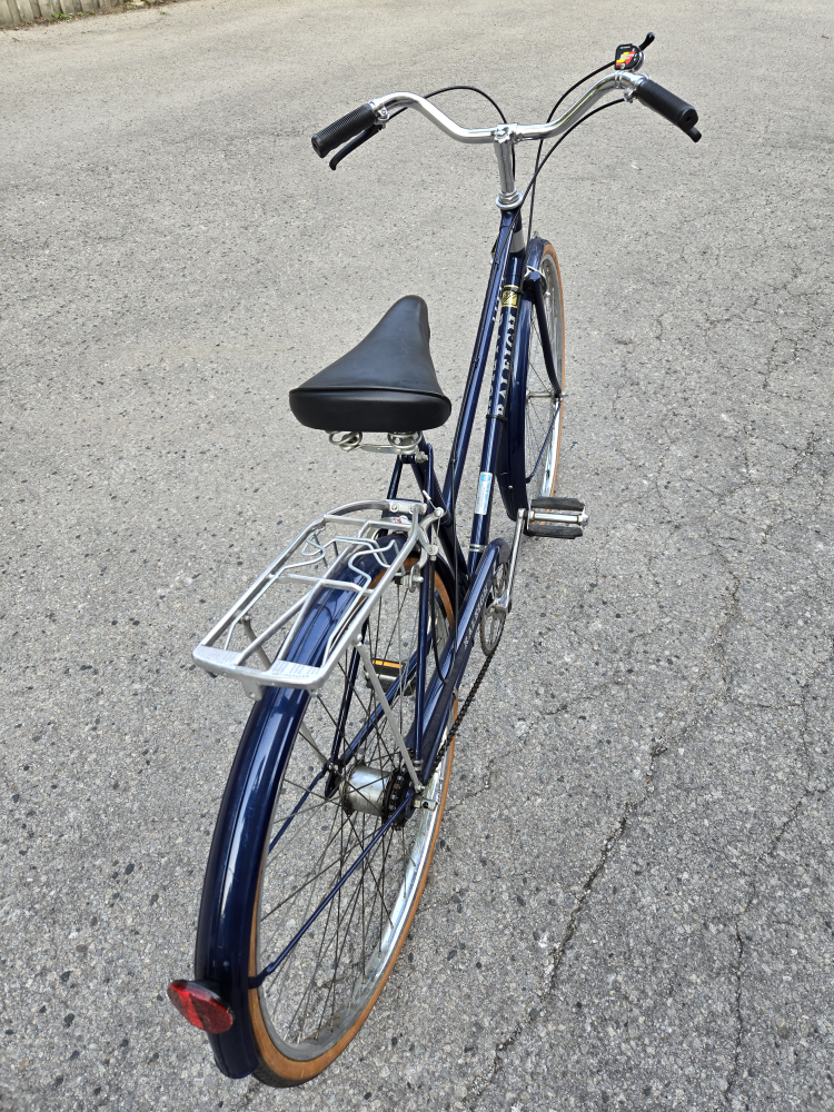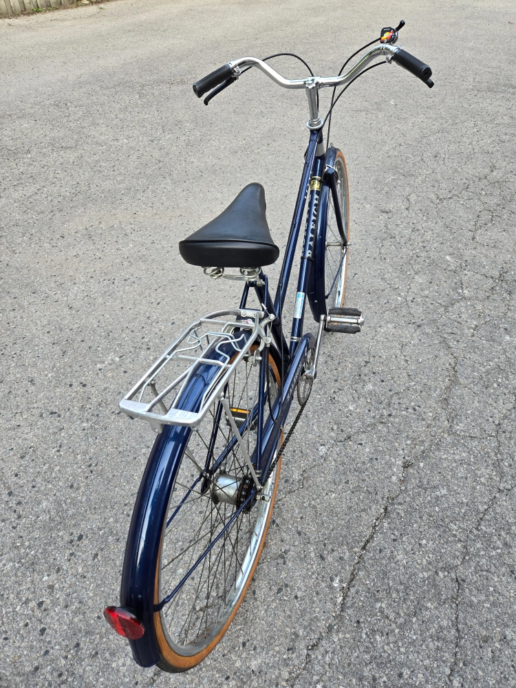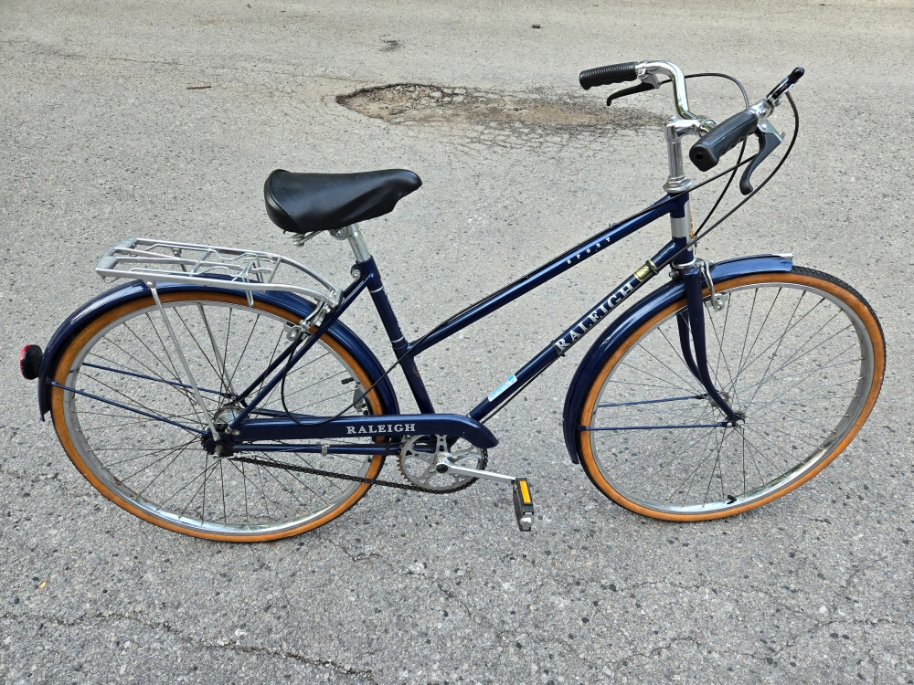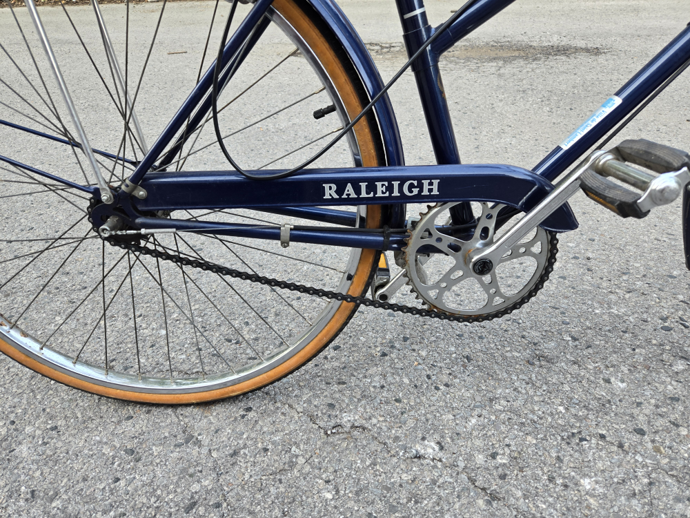 Vintage Raleigh bicycle with a blue frame and a rear rack. It has a classic design with a slightly curved handlebar and a single-speed gear system. 3 speedw in great condition