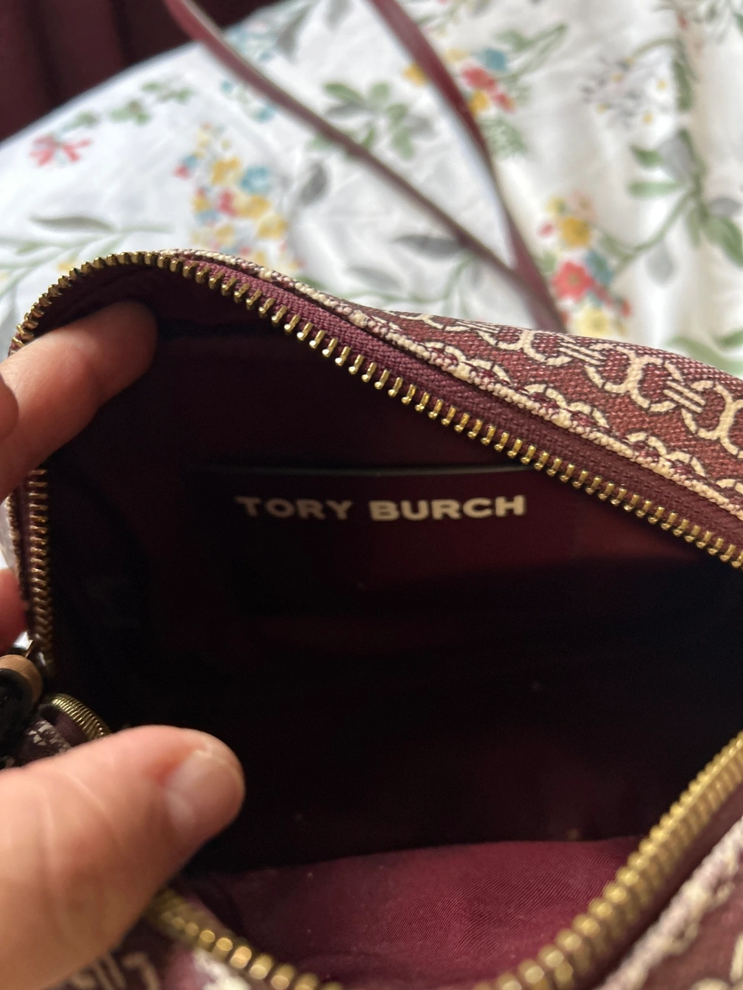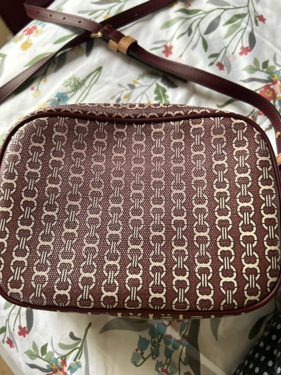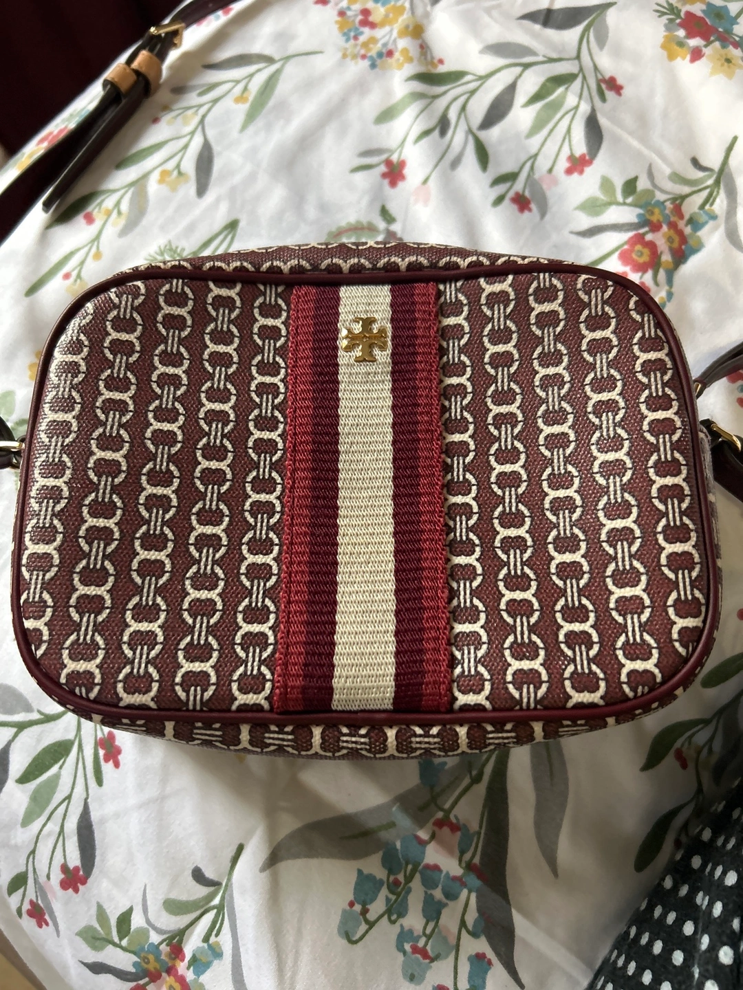 Small burgundy crossbody bag with a red, cream, and gold stripe running down the centre. A little bit faded at the back