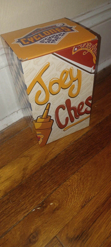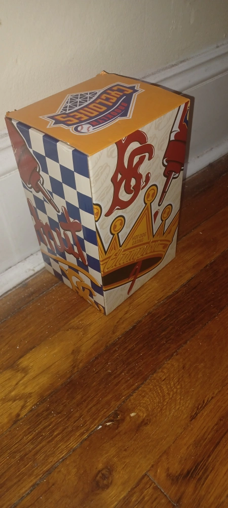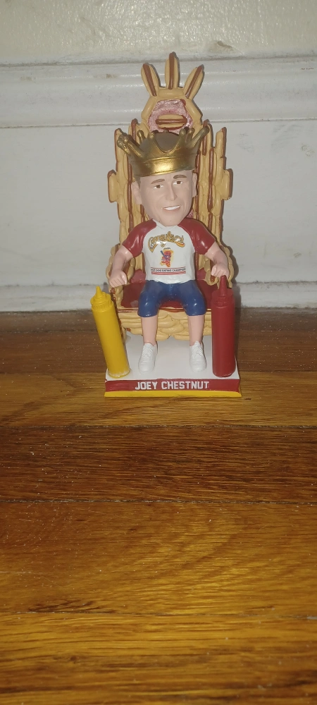 This figurine features Joey Chestnut on his hot dog eating throne. He is holding a mustard and ketchup bottle. It is made of plastic and is approximately 6 inches tall. The figurine has a gold crown on its head and a red and white shirt that reads "Nathan's Famous Hot Dog Eating Contest". There is a red and yellow base that reads "Joey Chestnut". The figurine is in good condition.