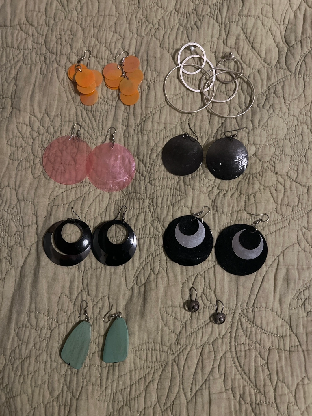 6 pairs of earrings for $5. Some pairs never worn. All have been sterilized with rubbing alcohol.