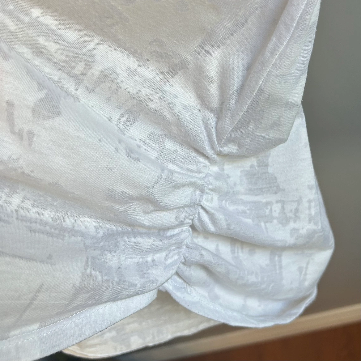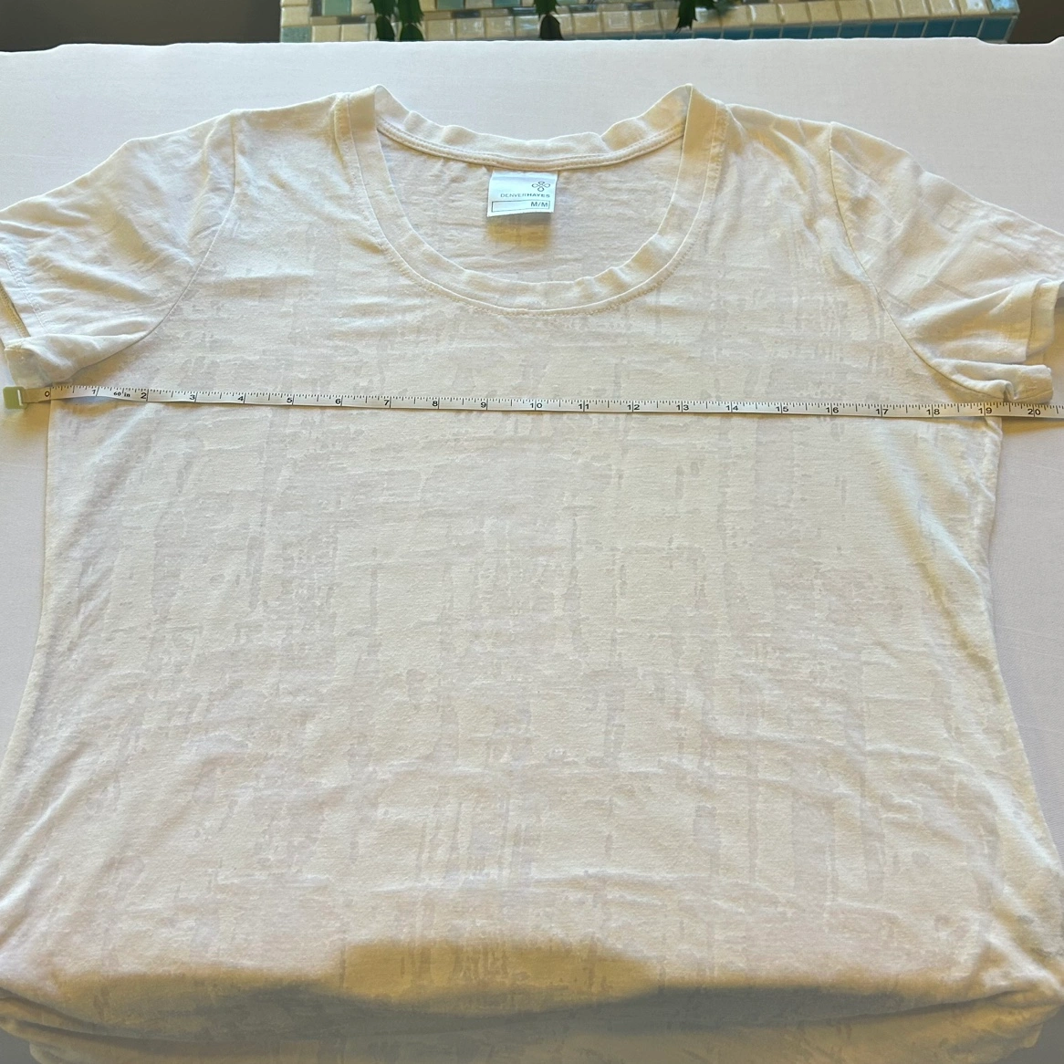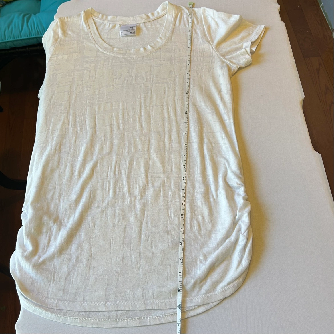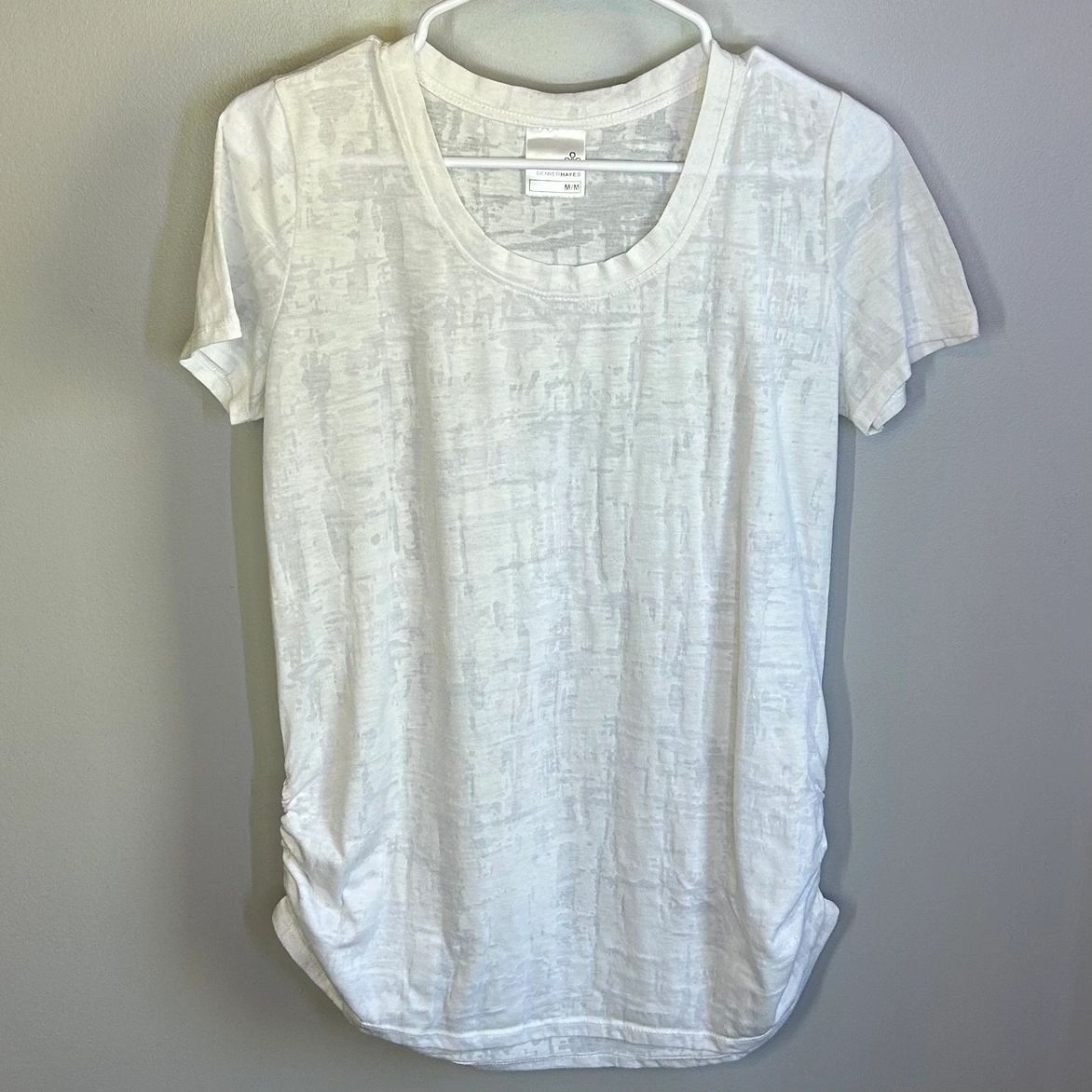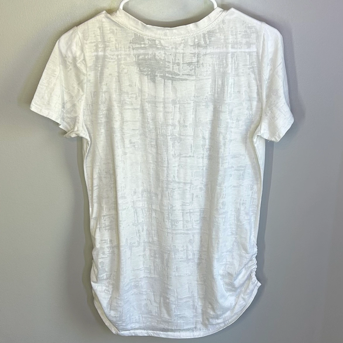 Elevate your casual wardrobe with this stylish women's scoopneck t-shirt from Denver Hayes, featuring a semi-sheer burnout pattern that adds a hint of allure. The short-sleeve tee is contemporarily designed with ruched sides, creating a flattering silhouette. Its versatile white hue and breathable fabric make it a perfect choice for a relaxed yet chic look that transitions effortlessly from day to evening. Hardly worn. Women’s size M. See photos for measurements. Cross posted.