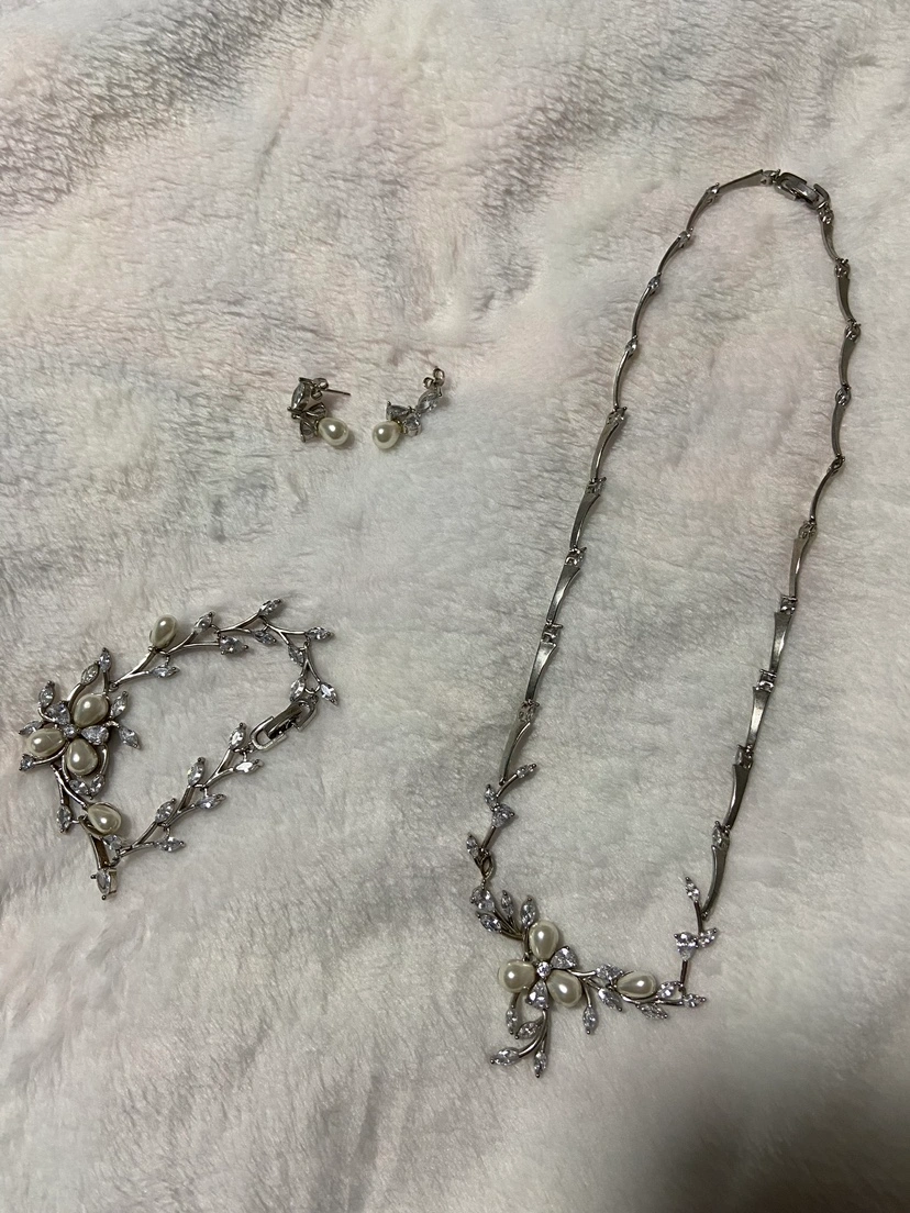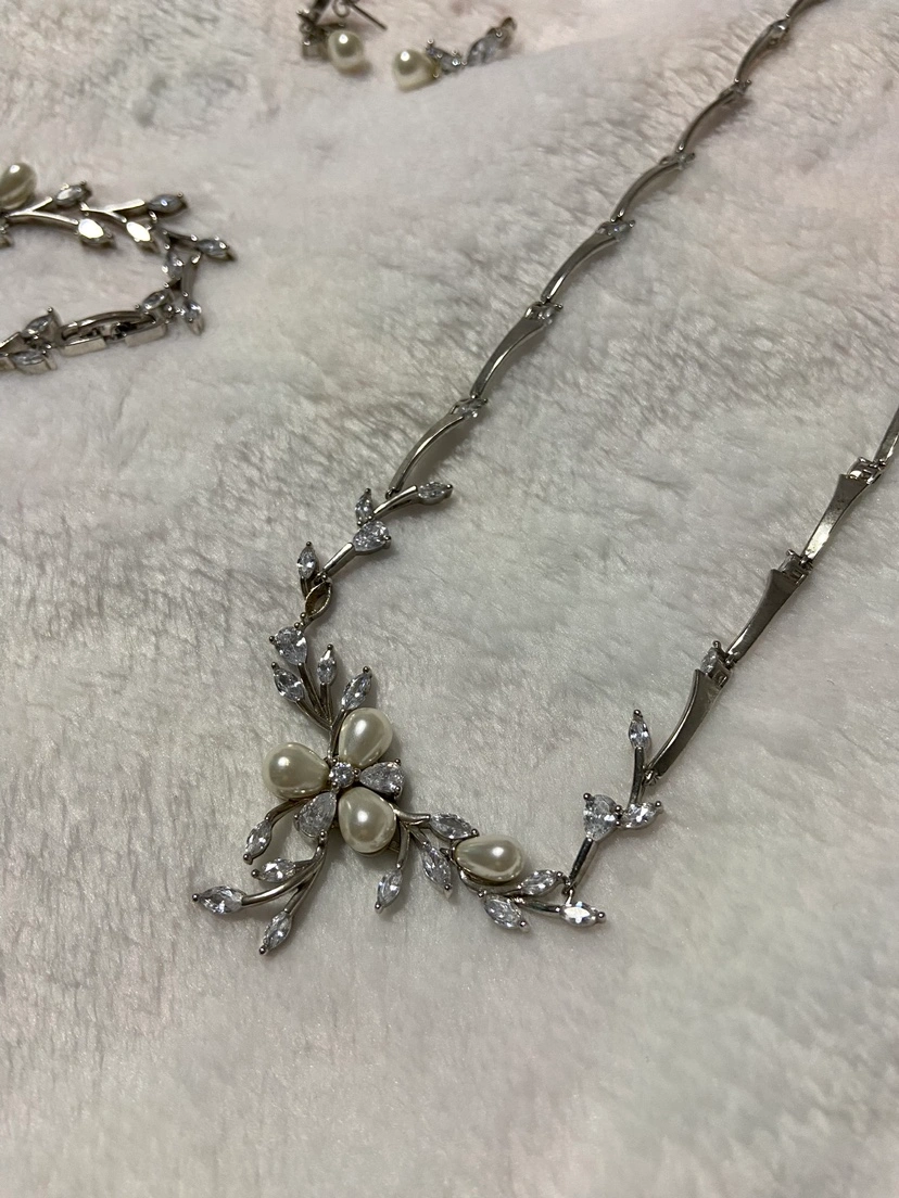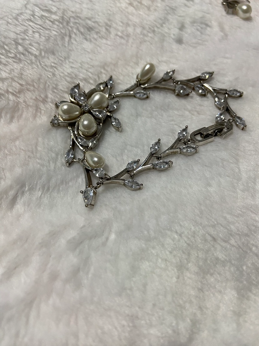 A beautiful three piece set including a necklace, bracelet, and earrings. All pieces feature pearl and crystal accents.