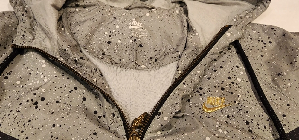 For women, Nike Windrunner jacket with a black and grey paint splatter design. It has a hood and two zippered pockets.