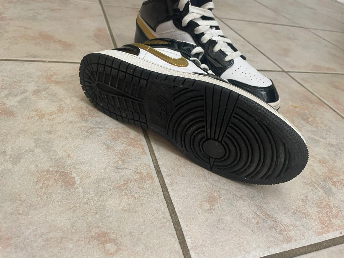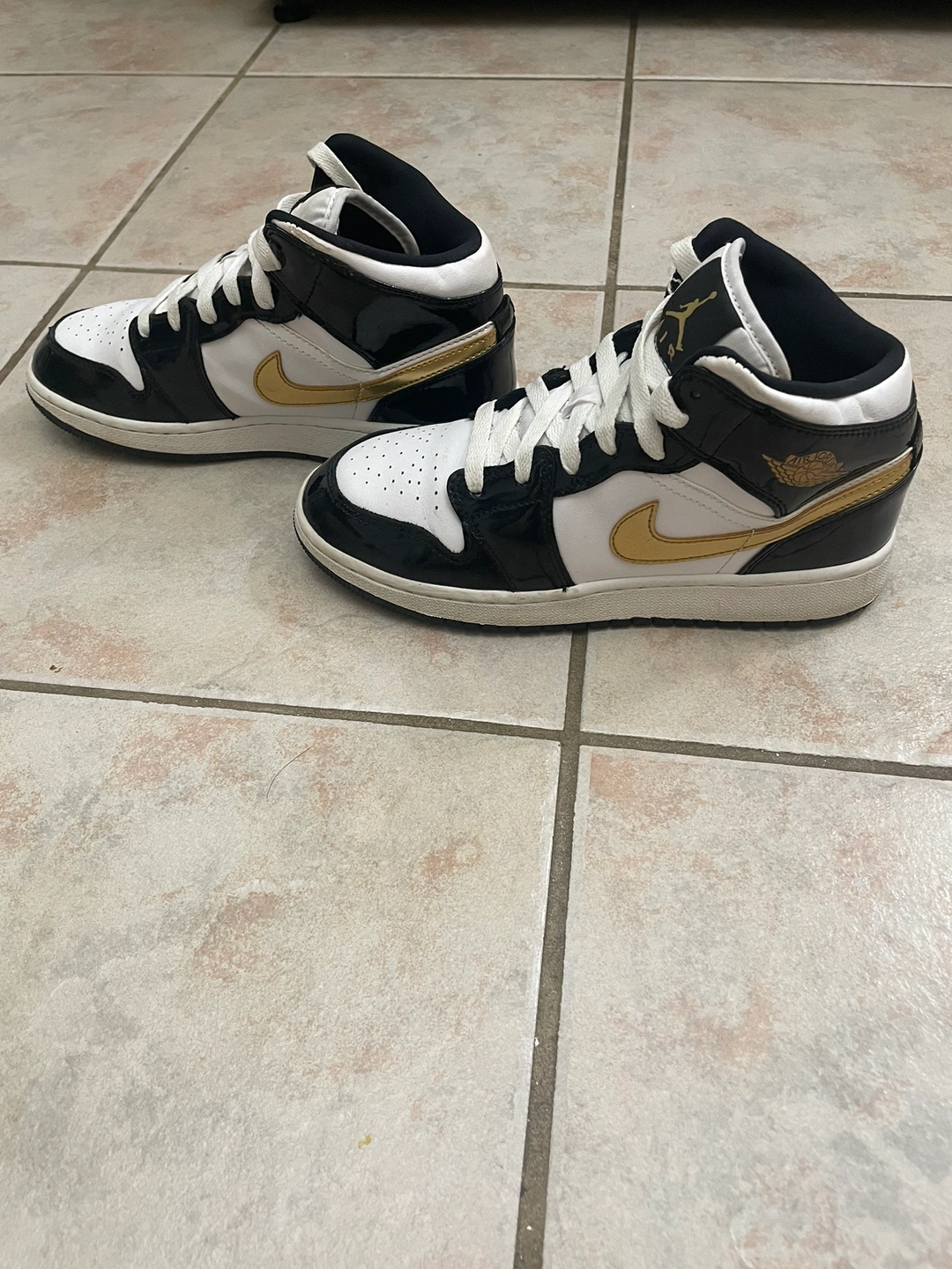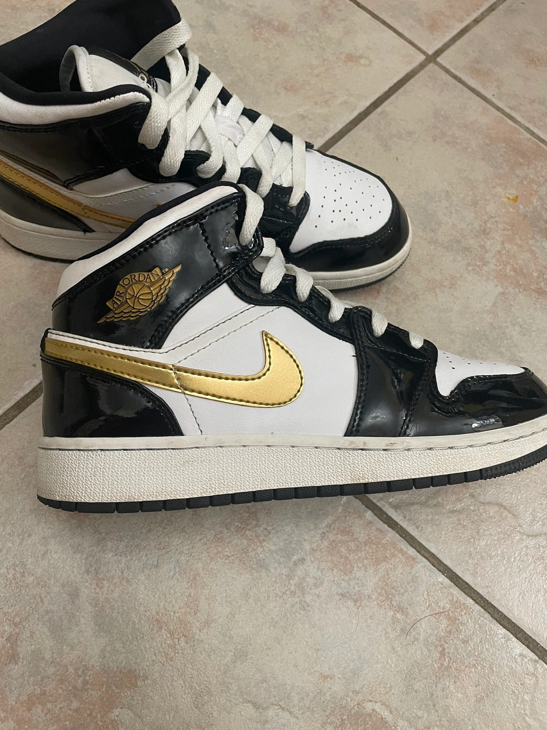 Worn ONLY once. Genuine Air Jordan 1 mid patent black, white and gold