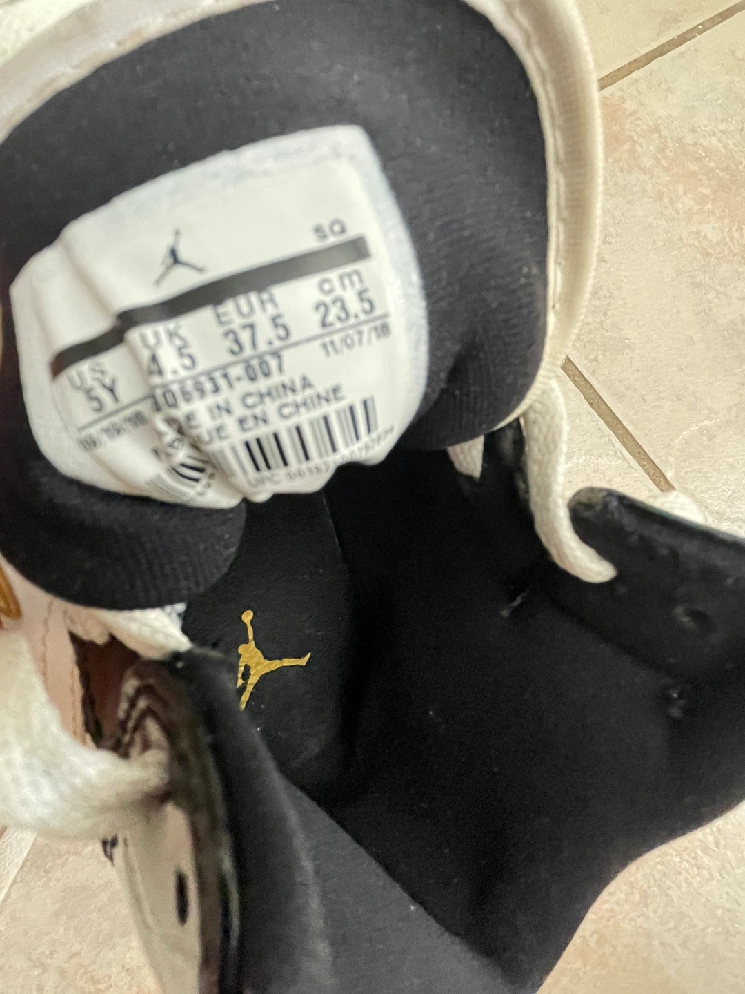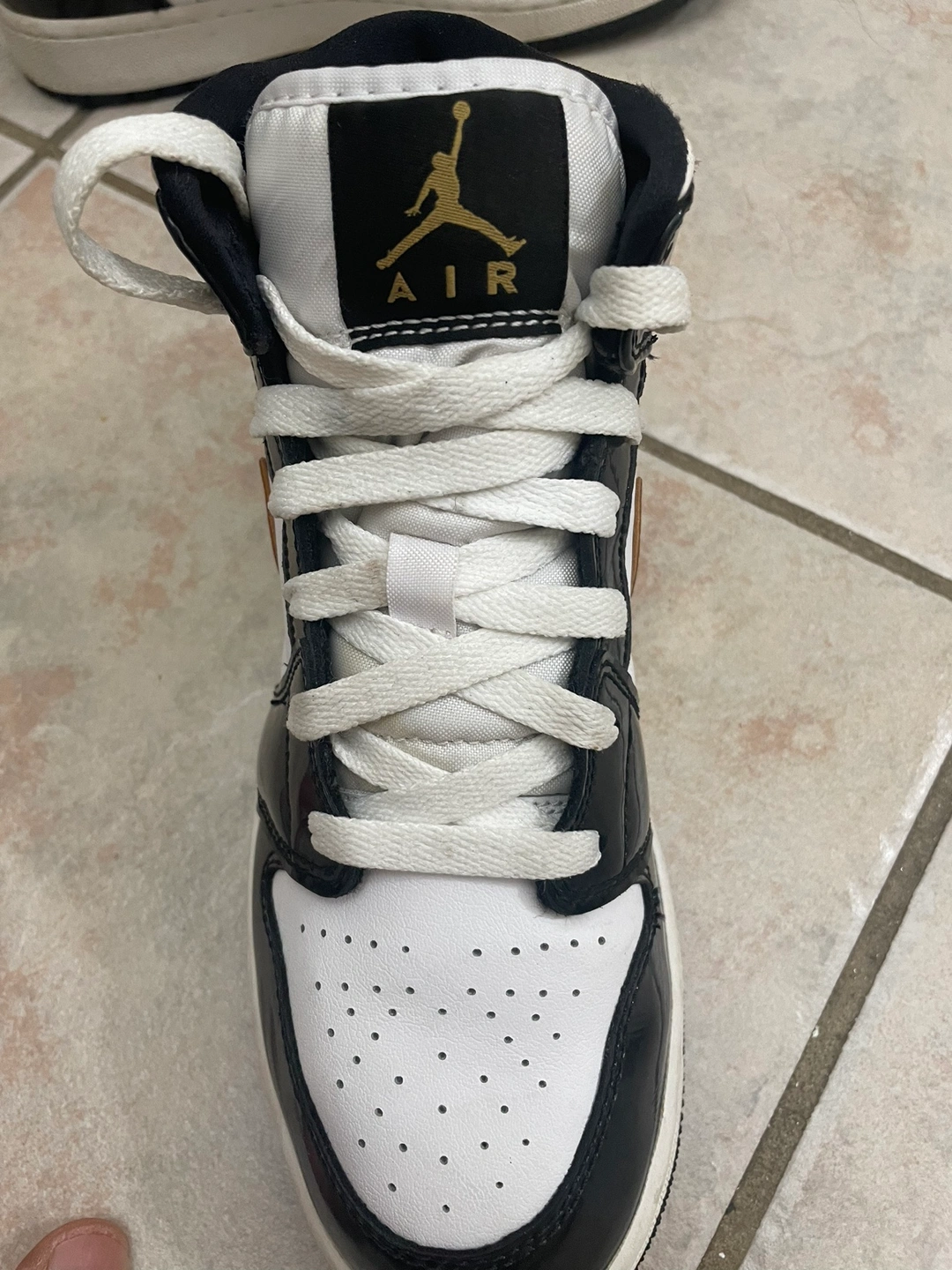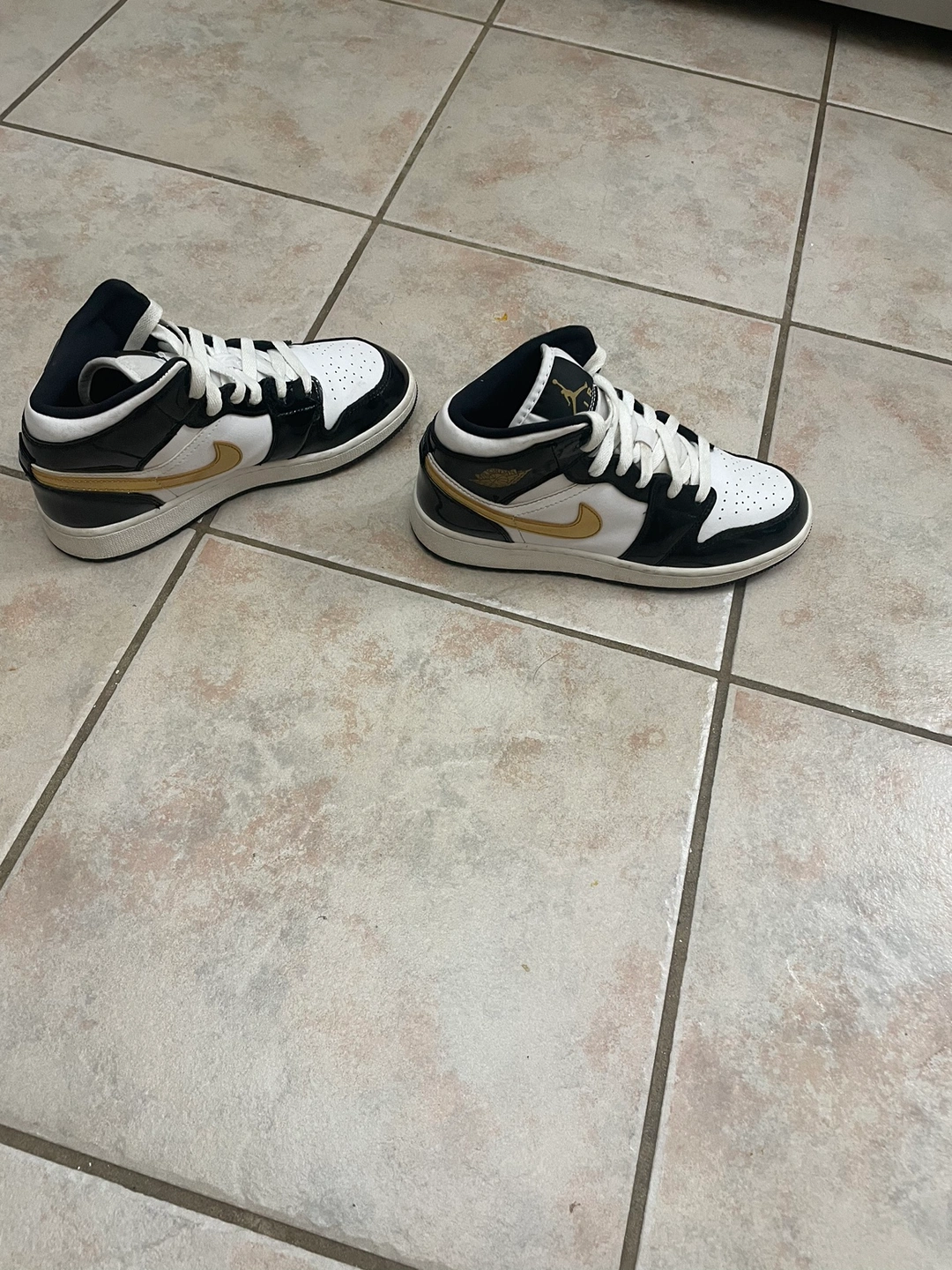 Worn ONLY once. Genuine Air Jordan 1 mid patent black, white and gold