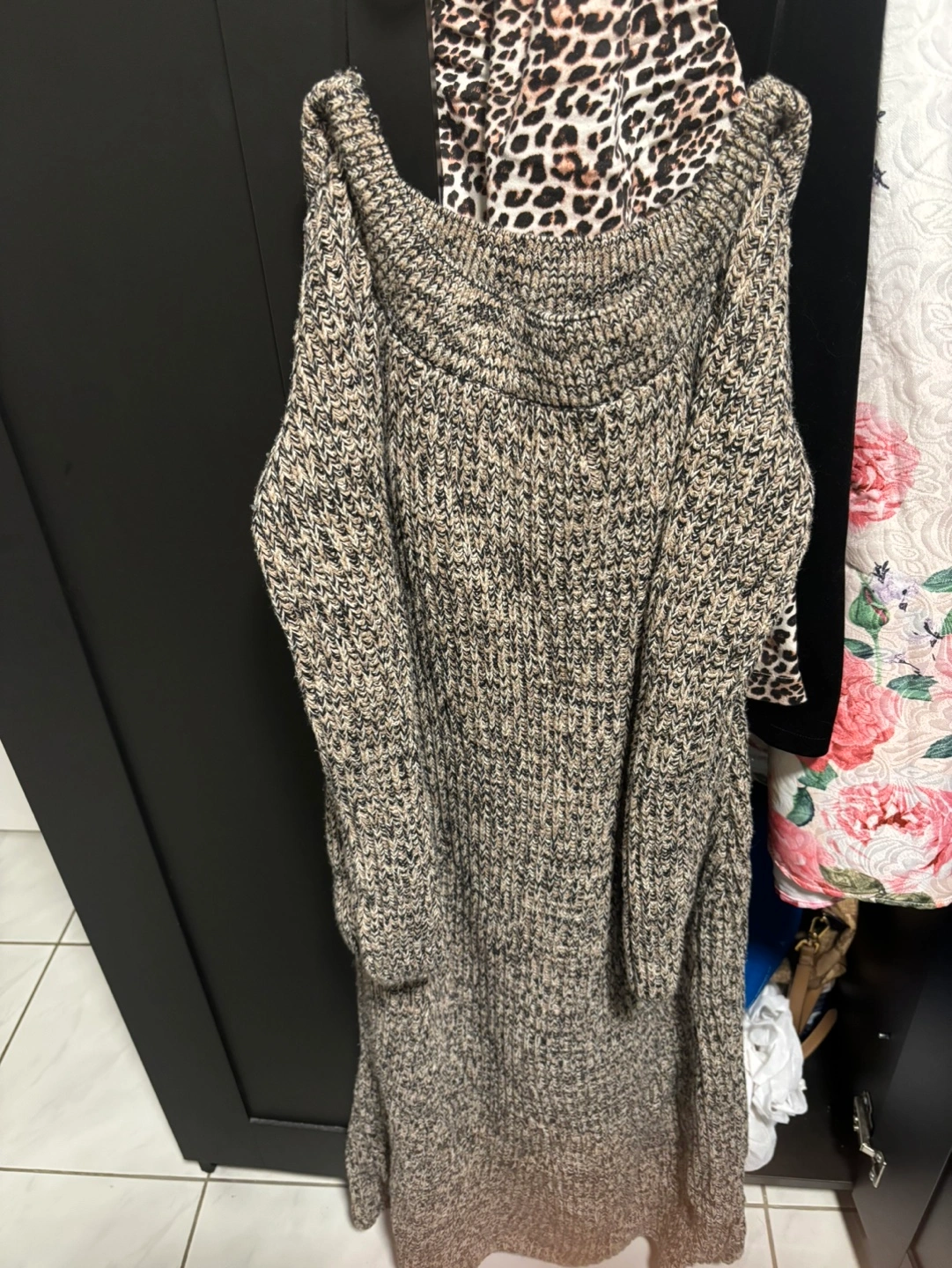 A long beige and black knit dress with long sleeves and an off-the-shoulder neckline.
