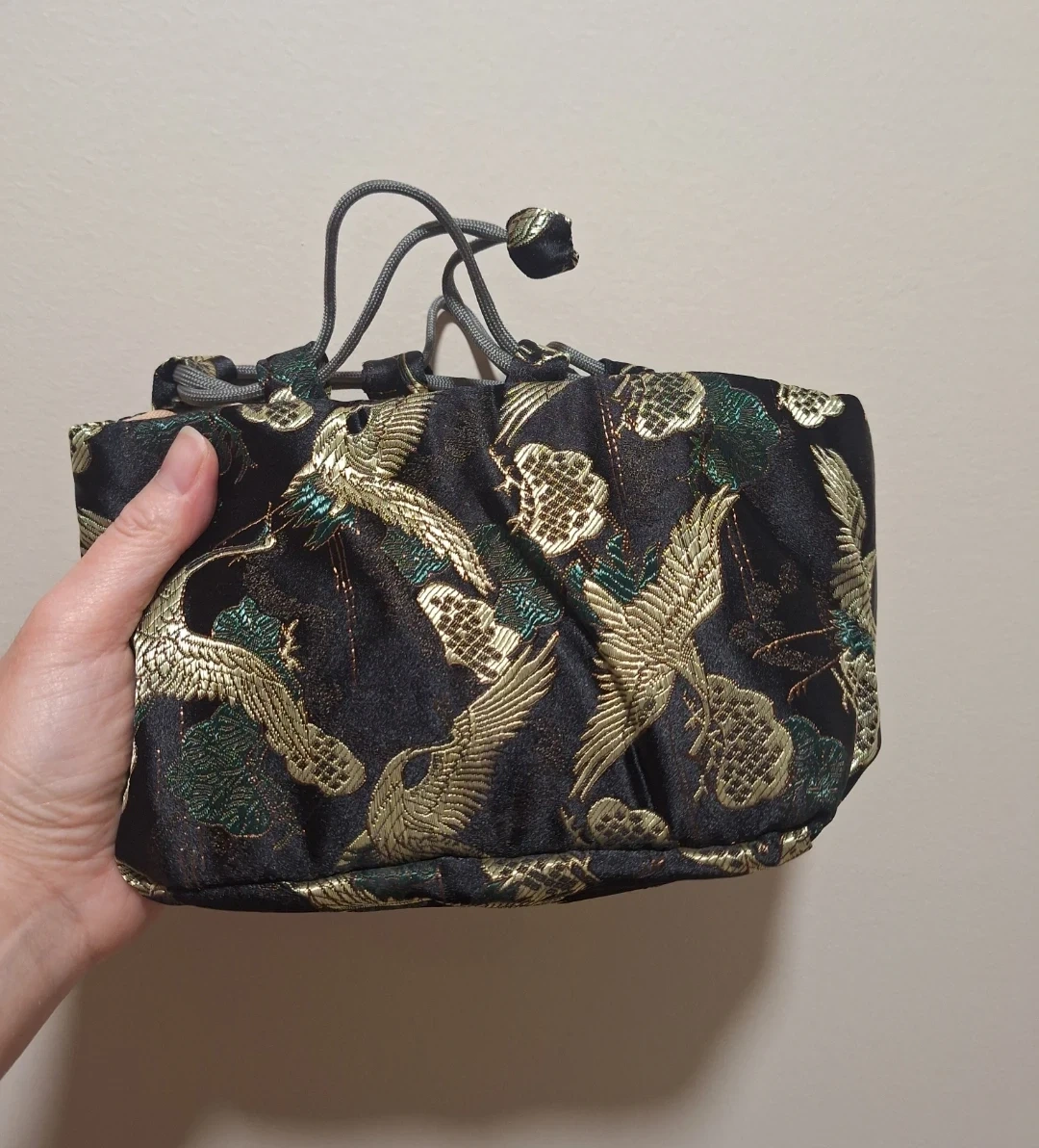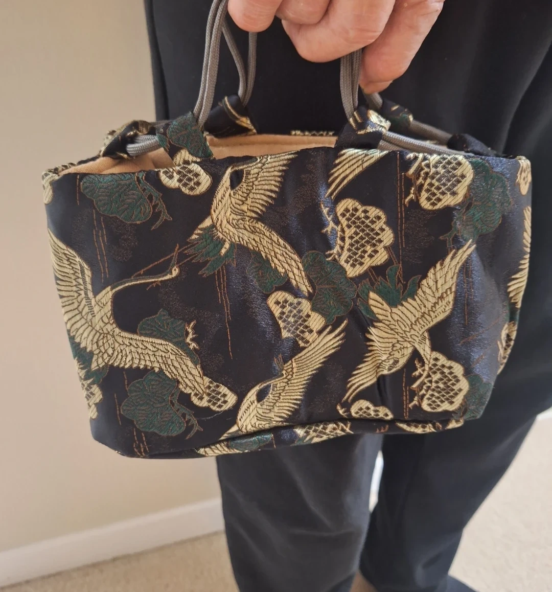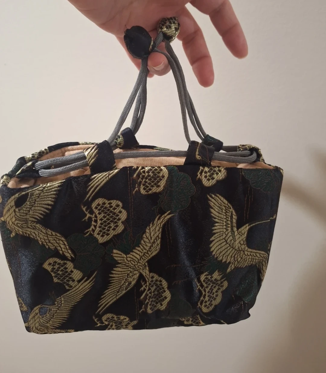 Japenese inpired pouch bag with embroidered design featuring cranes and floral motifs. Satin fabric with 2 inner pockets lining.