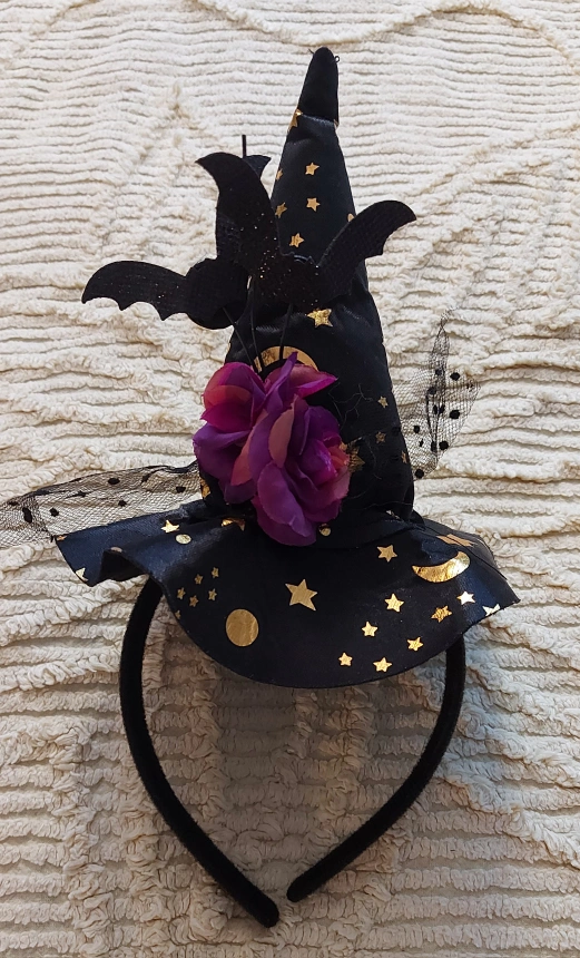 1000+A perfect accessory for completing a witchy halloween costume. This black witch hat headband is decorated with bats, stars and a purple flower. Never used. Pick up only Pet free and smoke free household Yonge and Eglinton area Only cash payment