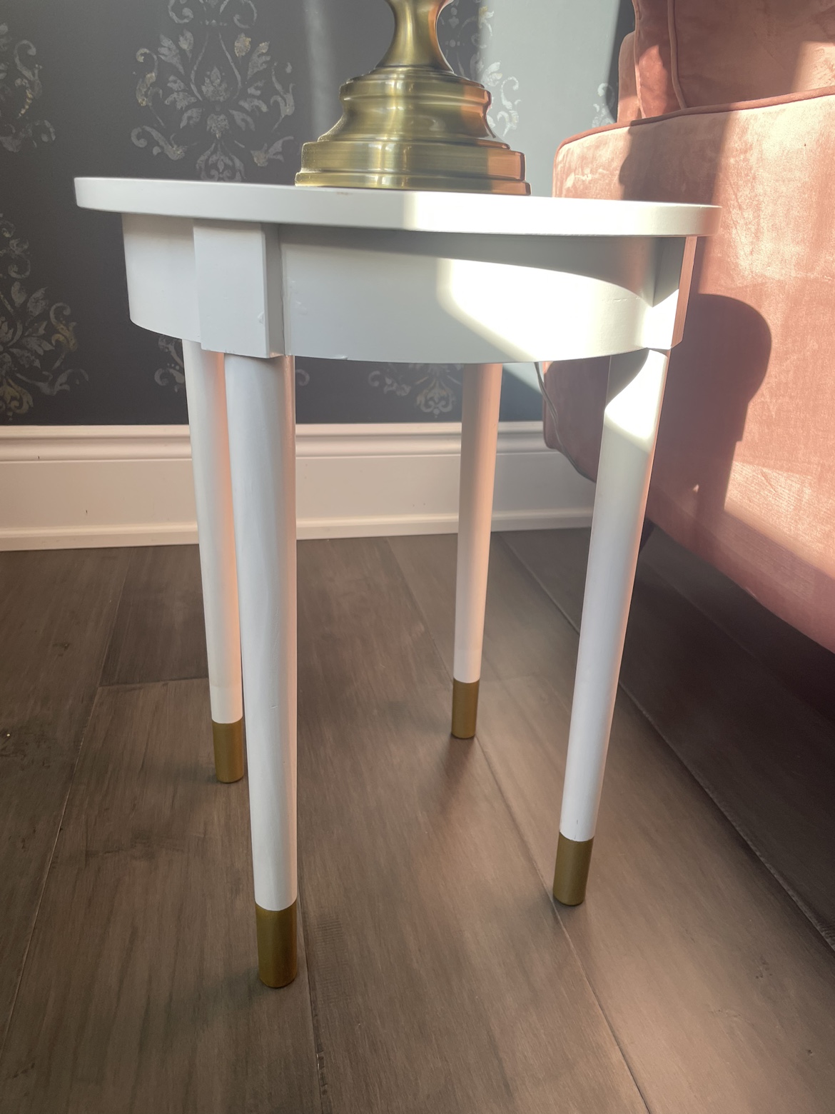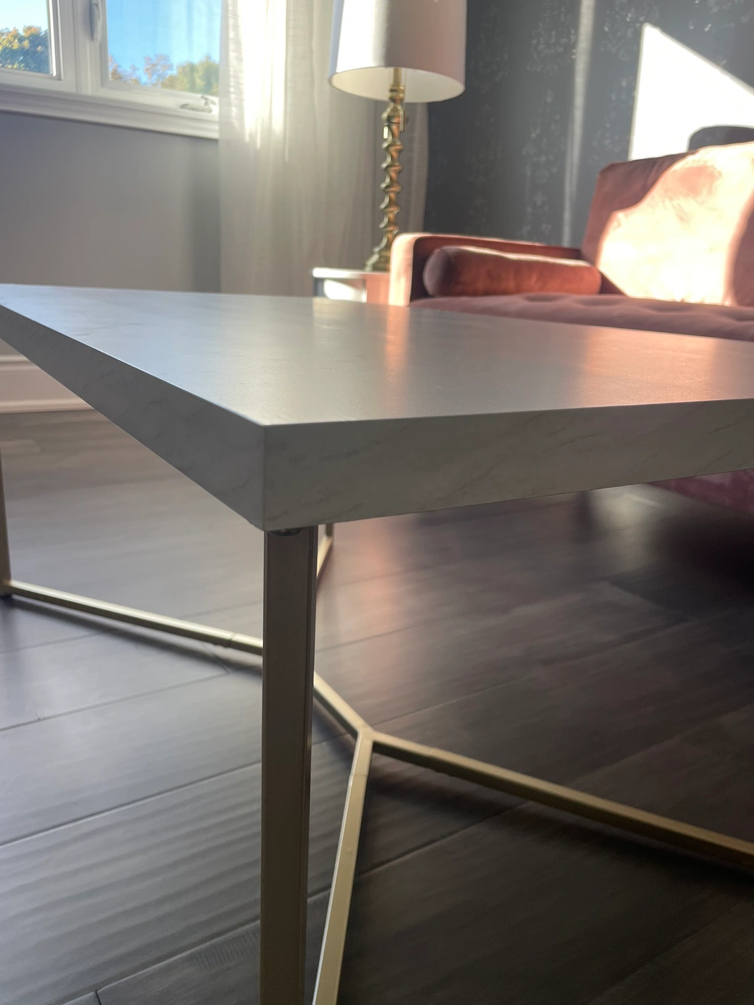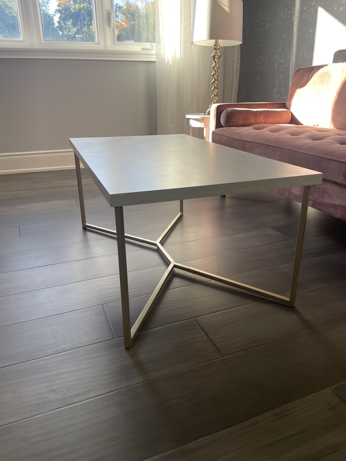 White coffee table (marble style laminate top with a gold base). The table top has a marbled design. There is a slight lip around the edges of the top. + end tables.