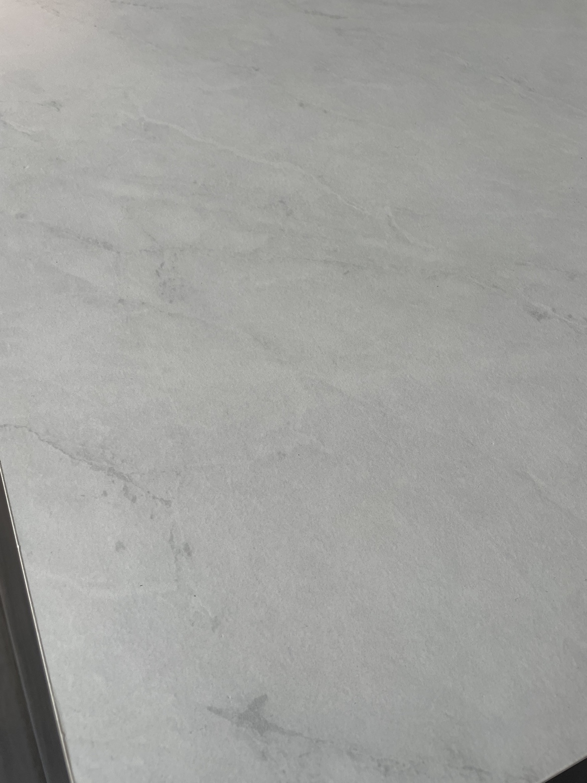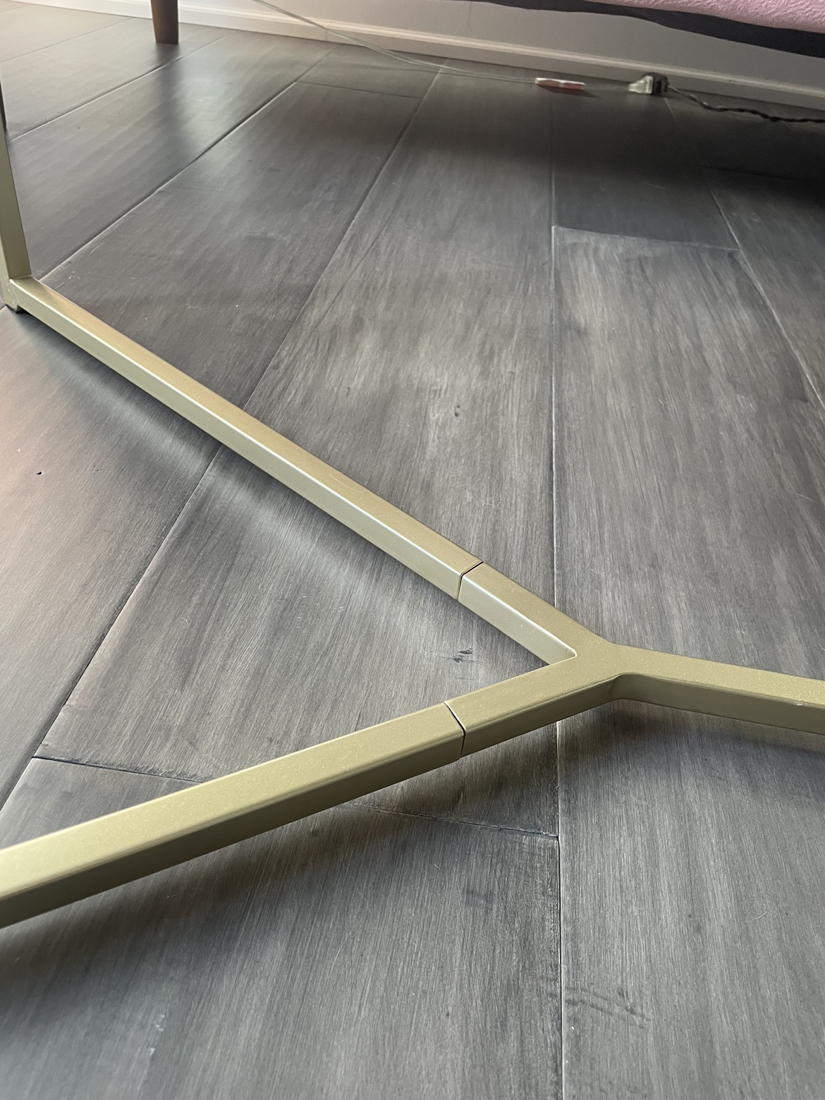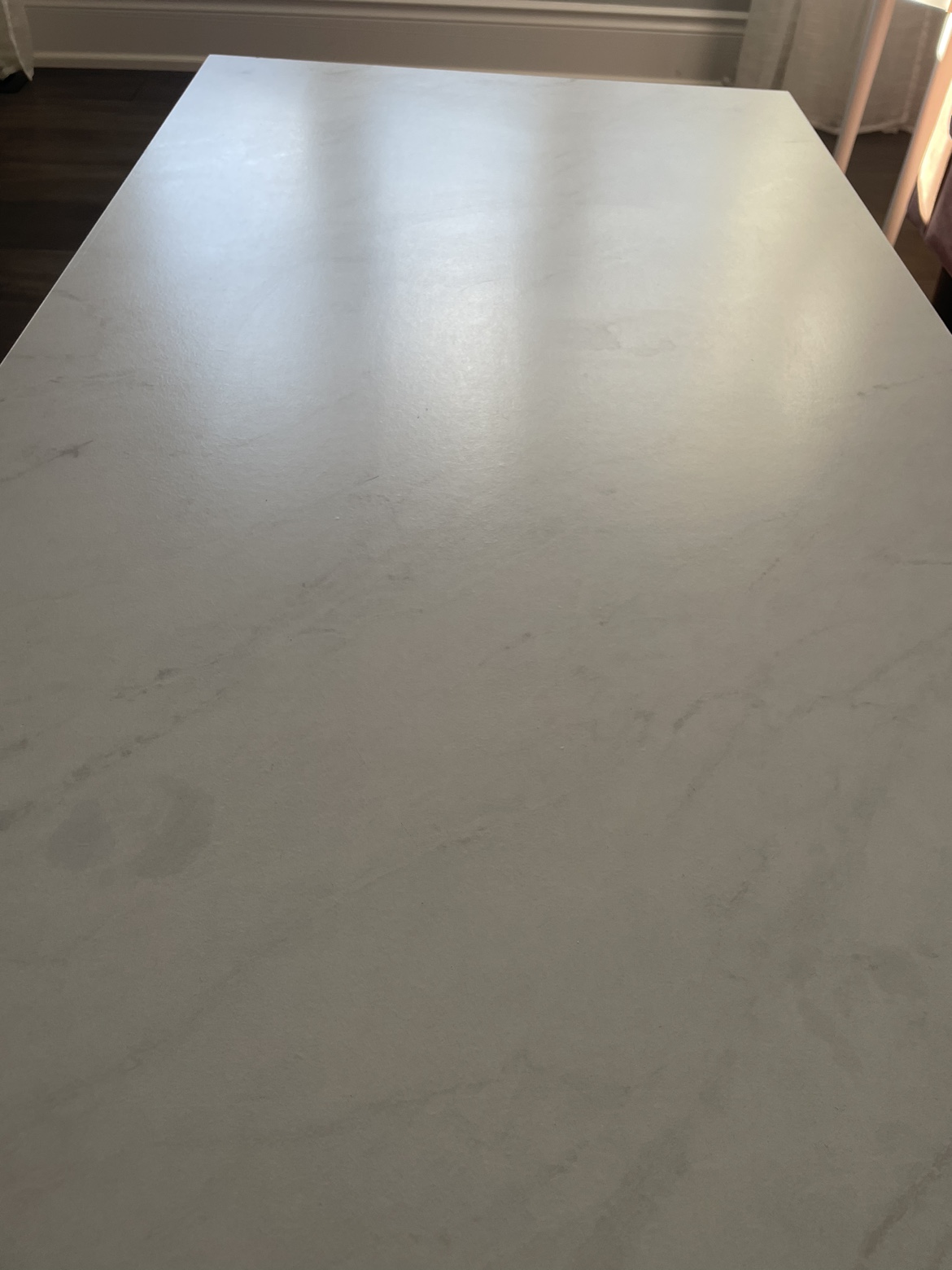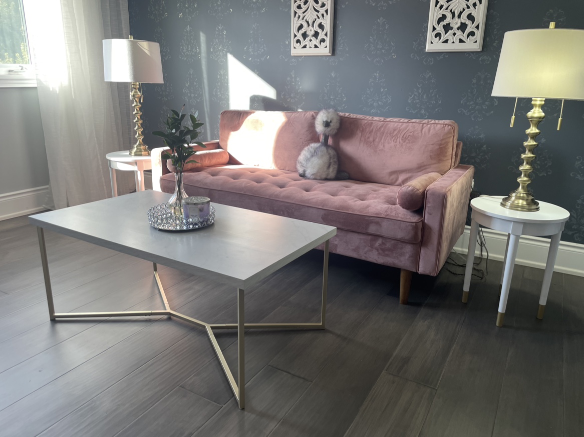 White coffee table (marble style laminate top with a gold base). The table top has a marbled design. There is a slight lip around the edges of the top. + end tables.
