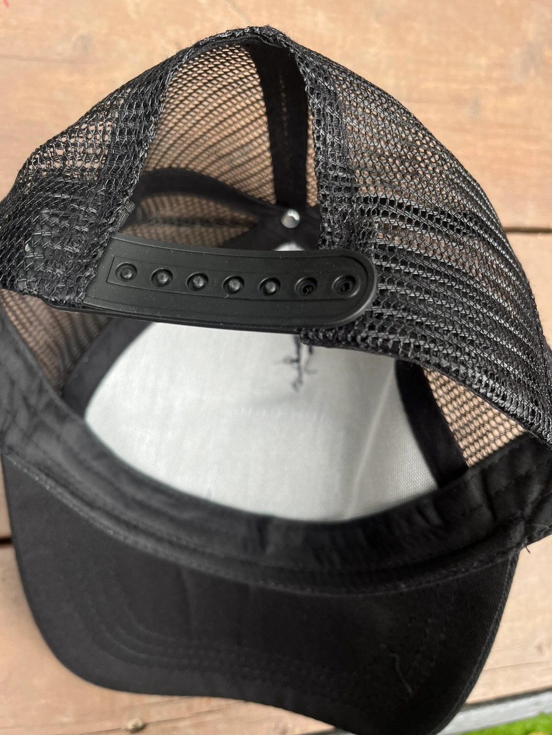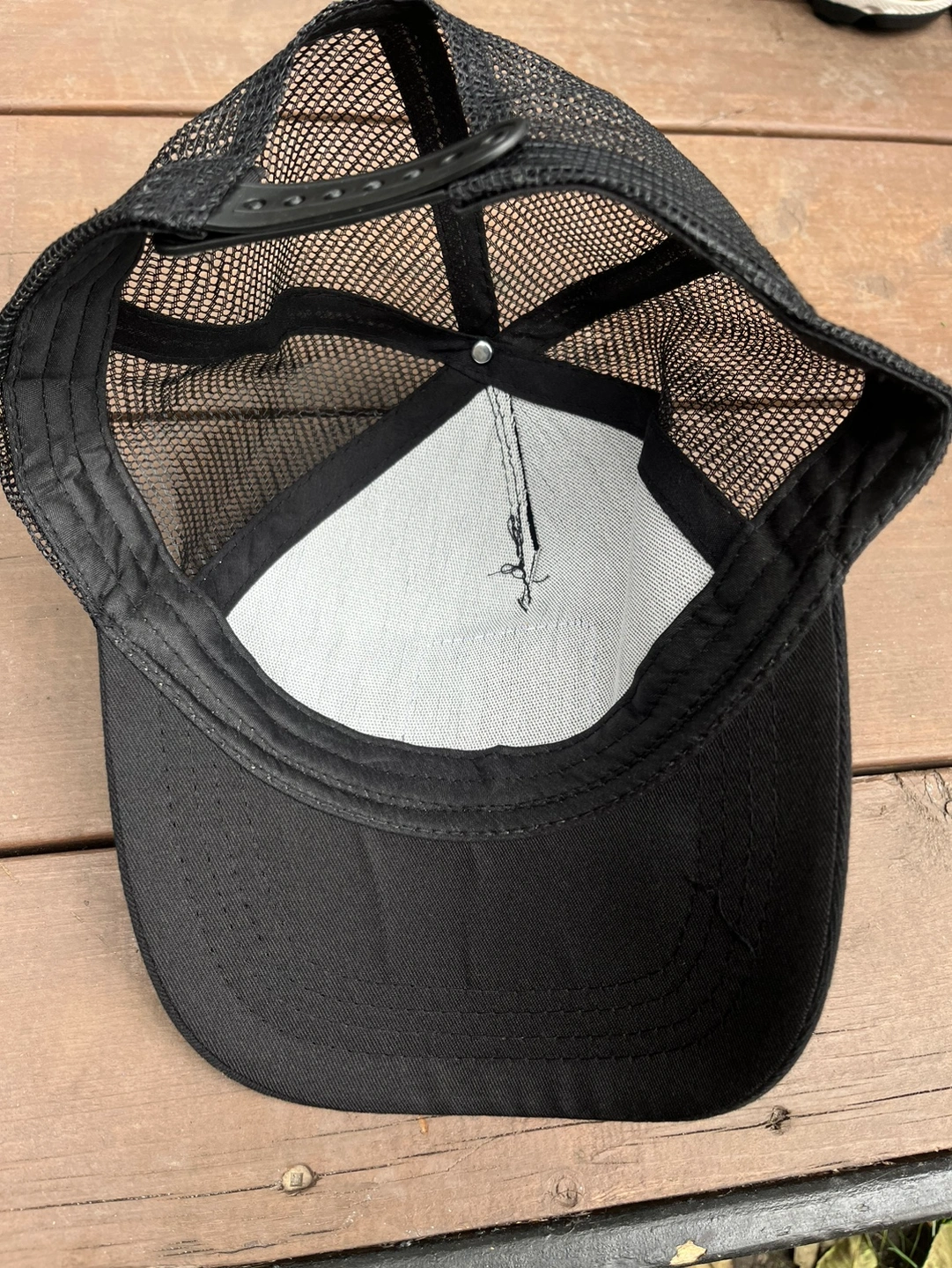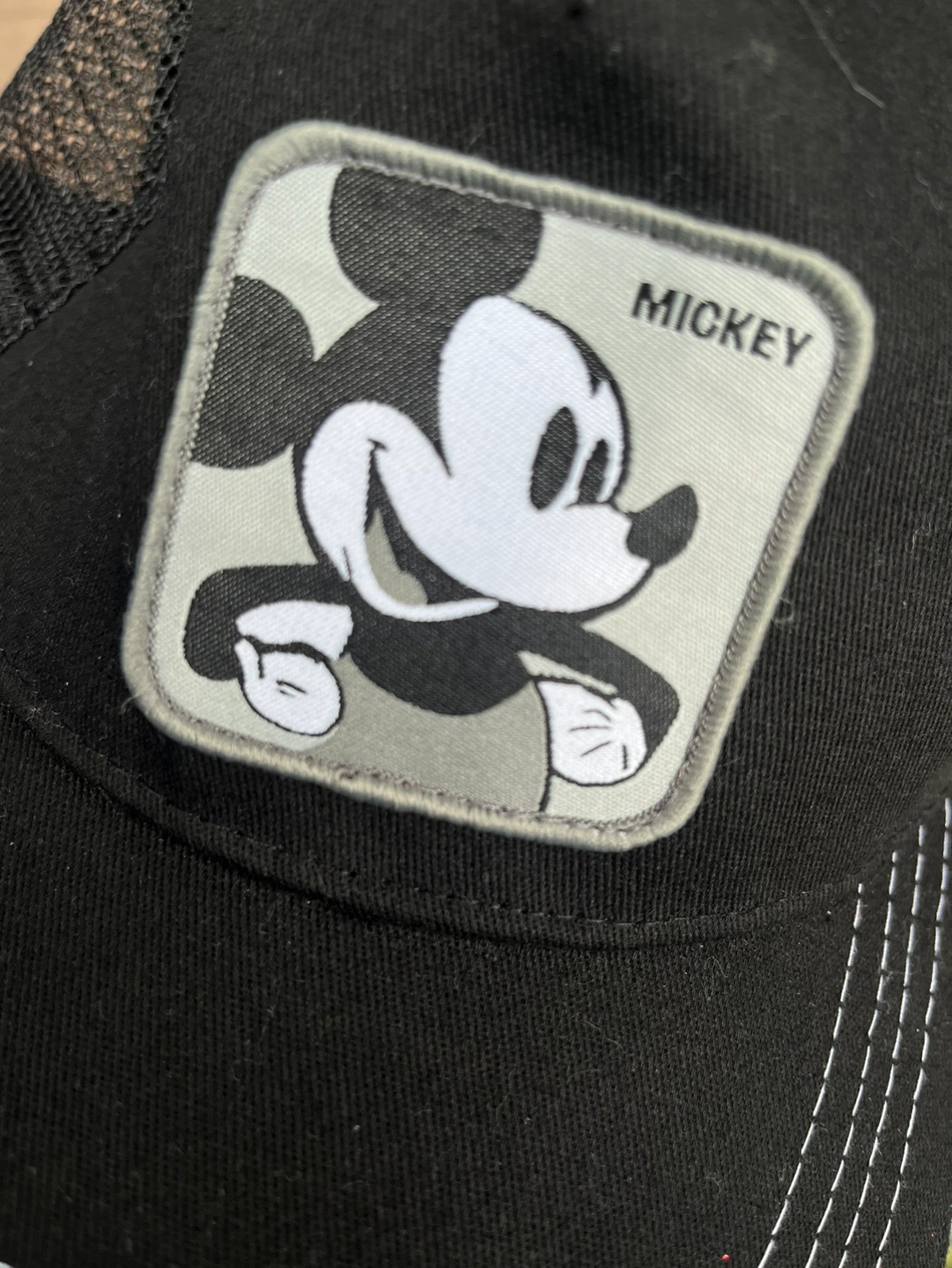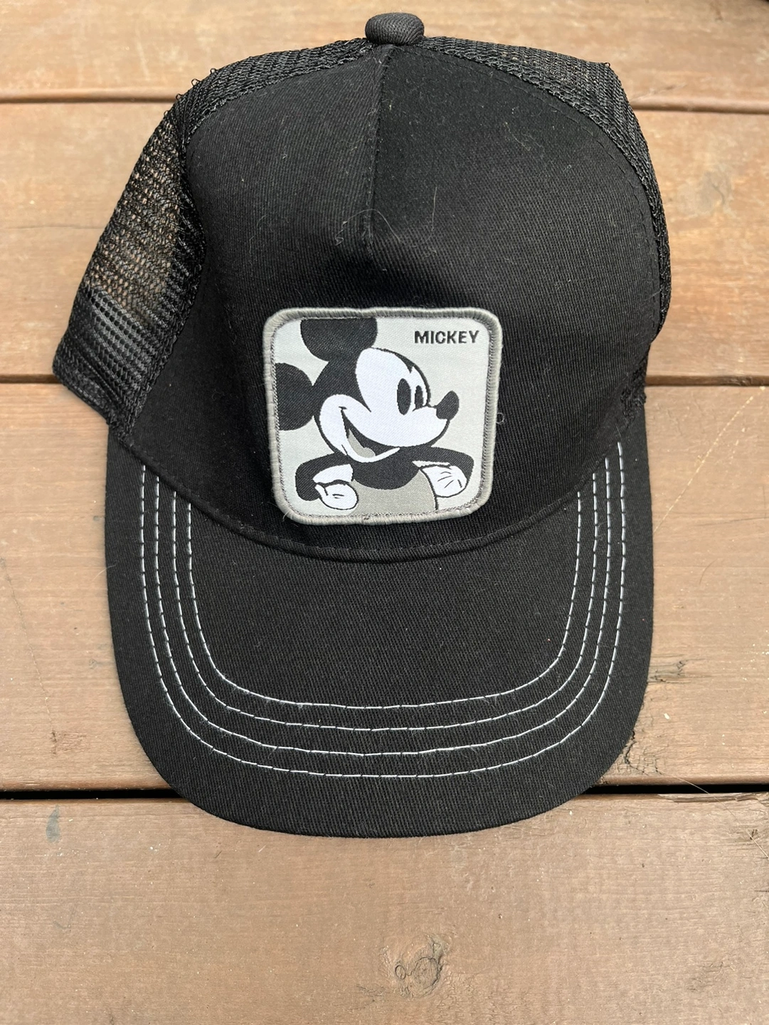 A black trucker hat with a Mickey Mouse patch on the front. The hat has a mesh back. The hat is adjustable. Pick up only