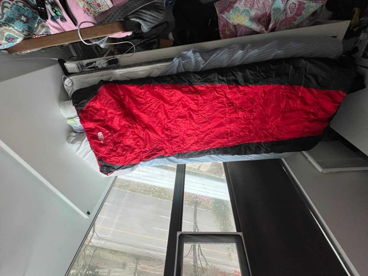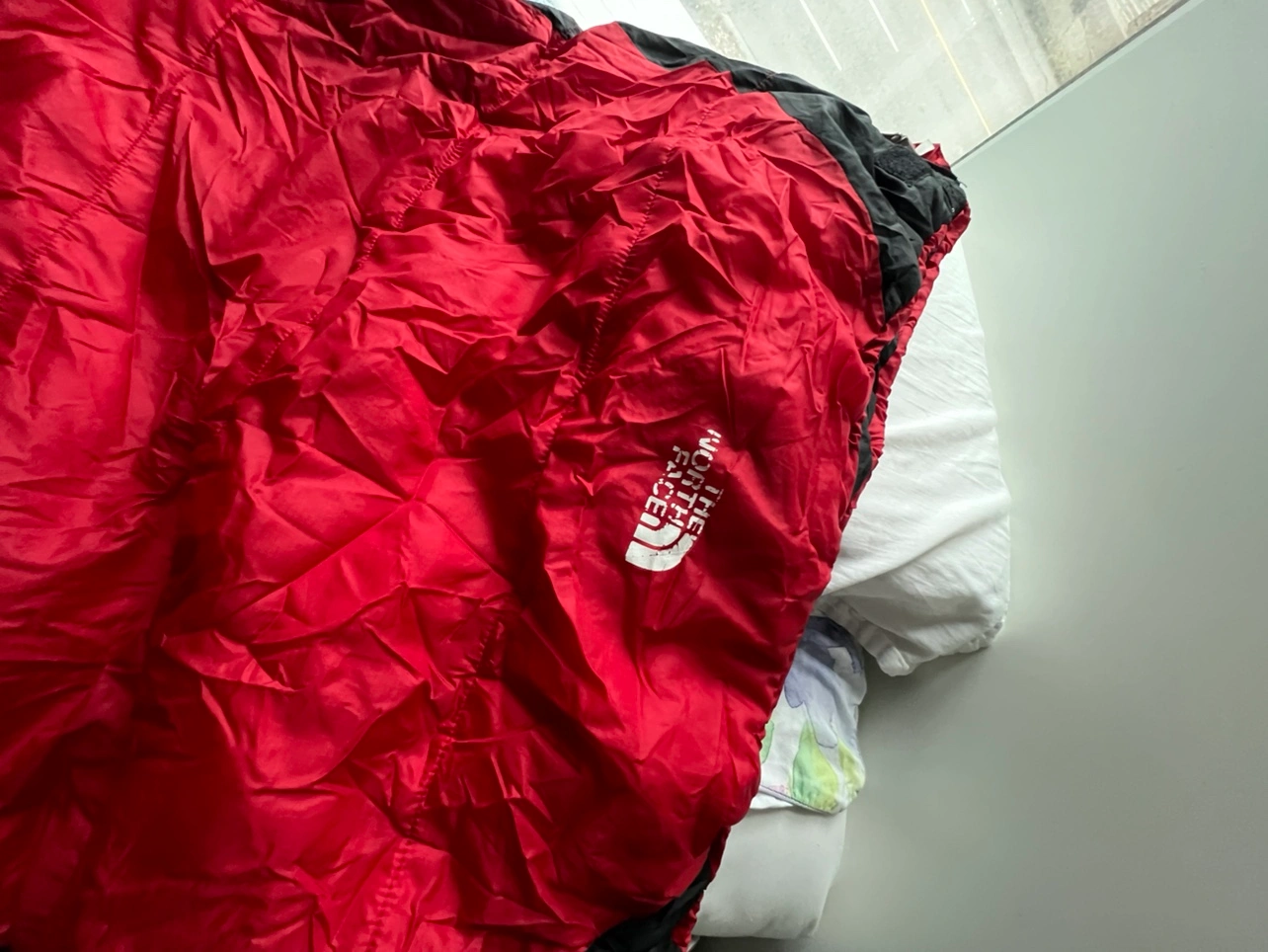 Sleeping bag by The North Face. It is a red and black sleeping bag with a zipper. It comes with a stuff sack. It is a warm sleeping bag for colder weather.