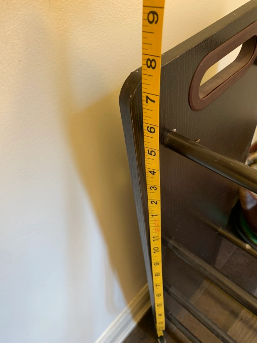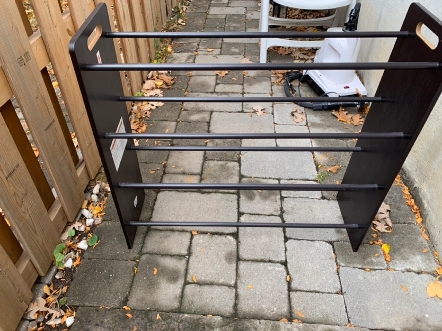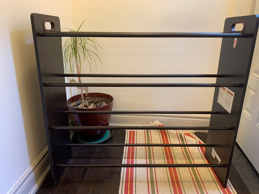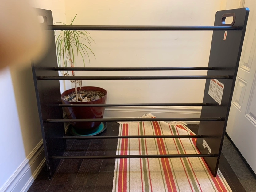 A 4 tier shoe rack that stands approximately 30 inches tall and is in great condition. It has 2 handles on each side of the rack and measures approximately 27 inches wide and 12 inches deep. It would make an excellent addition to any entryway or closet.